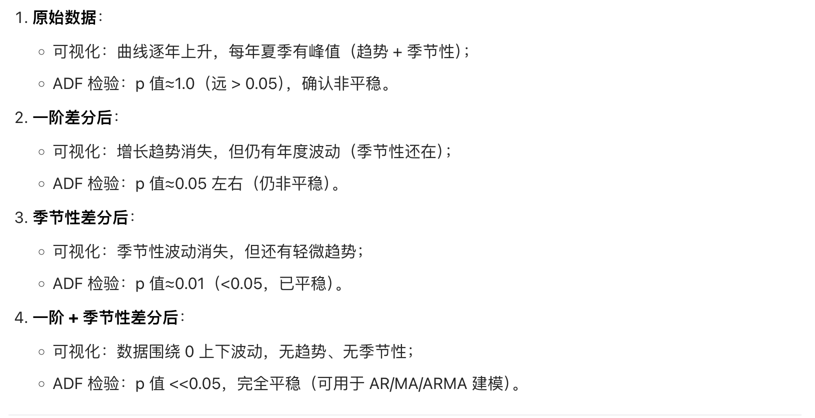 - 先可视化观察数据趋势 / 季节性 → 用 ADF 检验量化平稳性 → 用差分(n 阶 / 季节性)处理非平稳性 → 再次检验确认平稳;