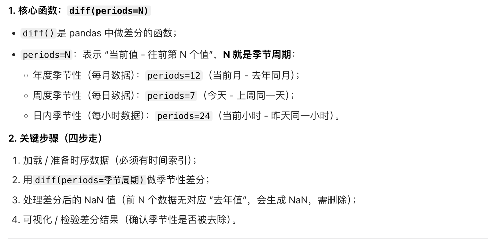 df['列名'].diff(periods=季节周期),周期数根据数据规律定(月度年度 = 12、日度周度 = 7、小时度日内 = 24); - 必做步骤 :差分后需用