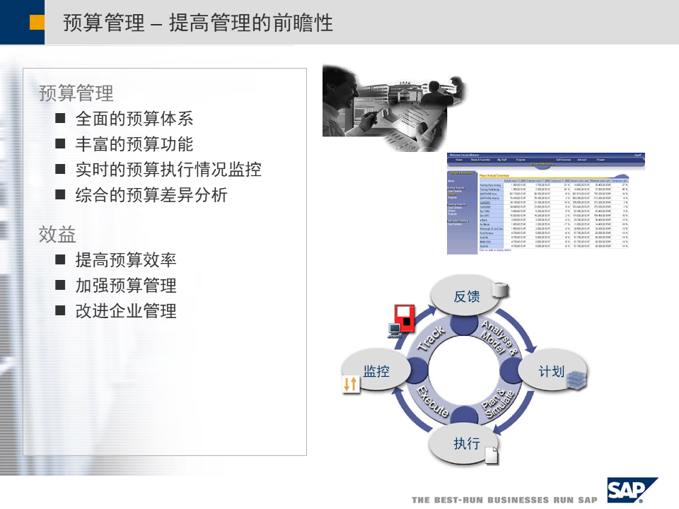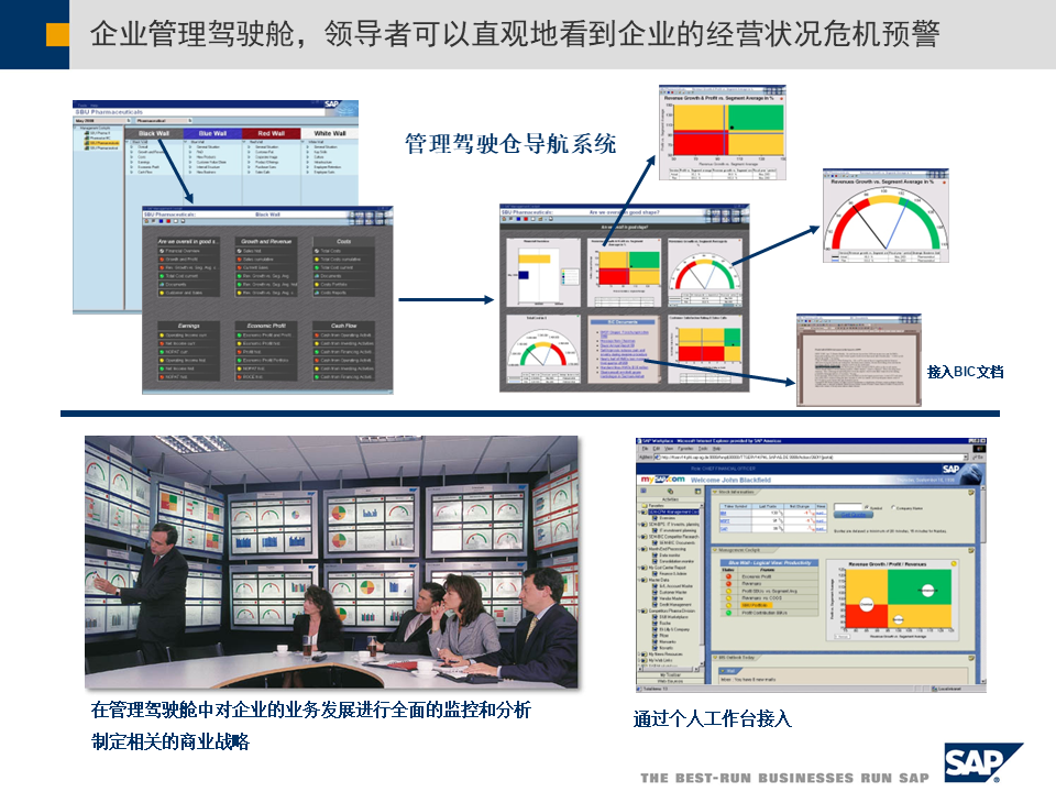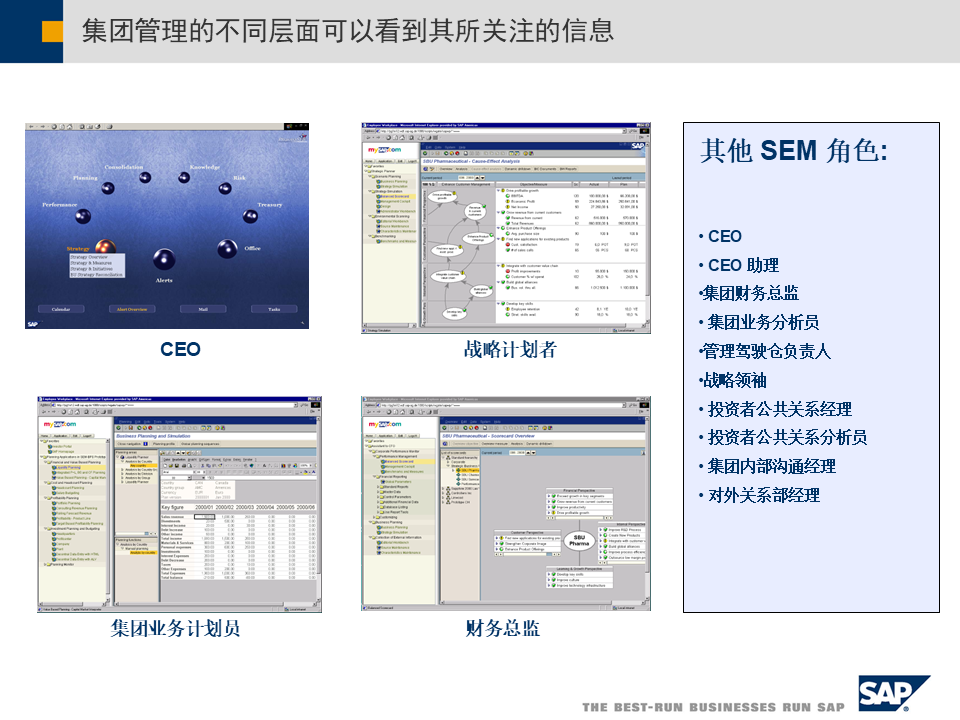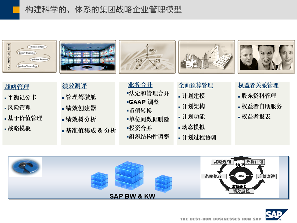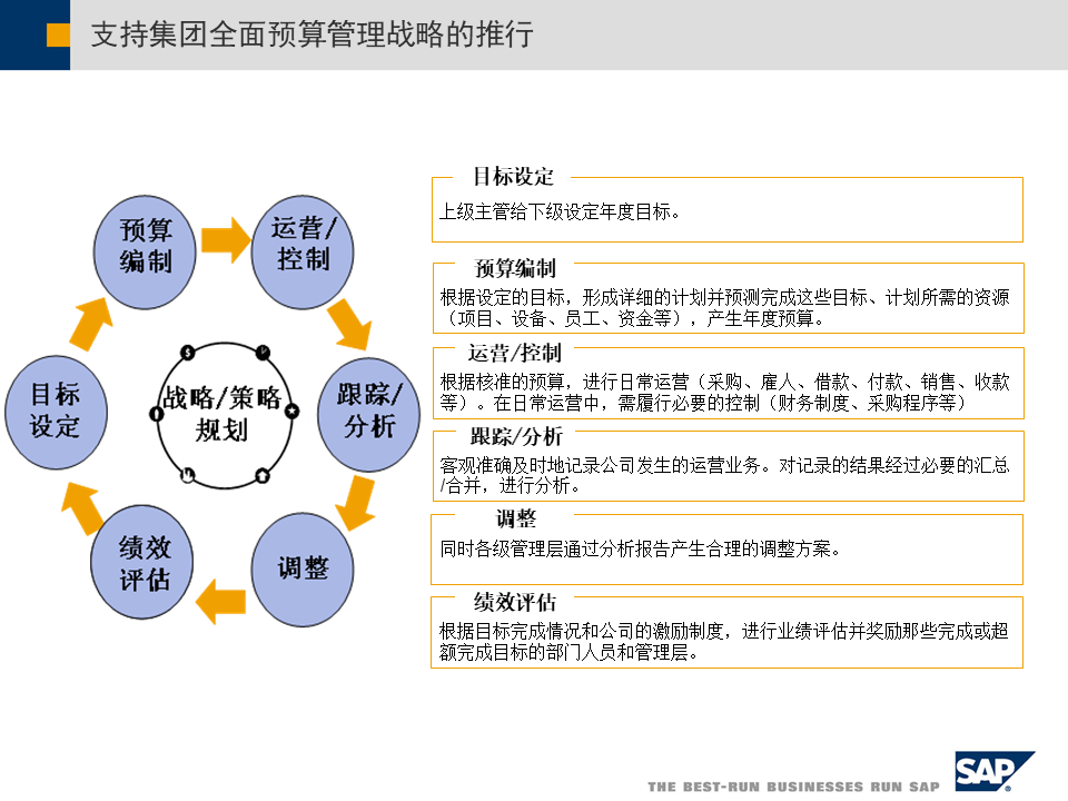 - 战略企业管理(SEM):将平衡计分卡、管理驾驶舱等工具融入系统,实时监控战略执行情况[3]。