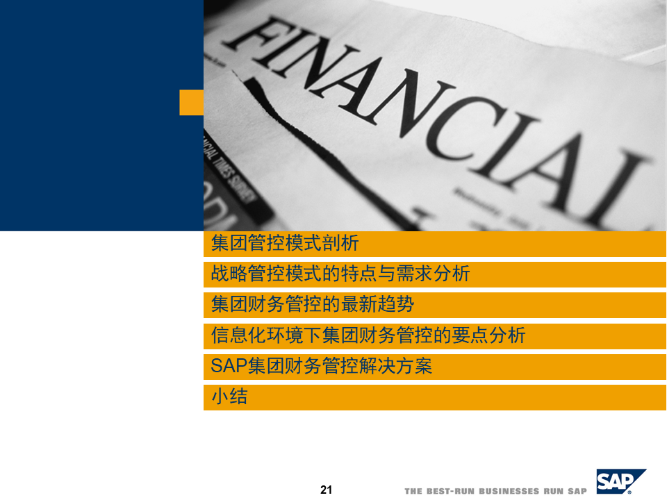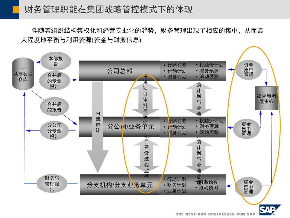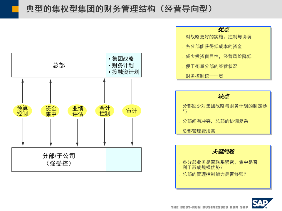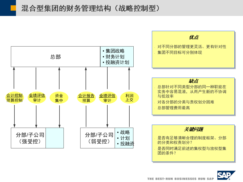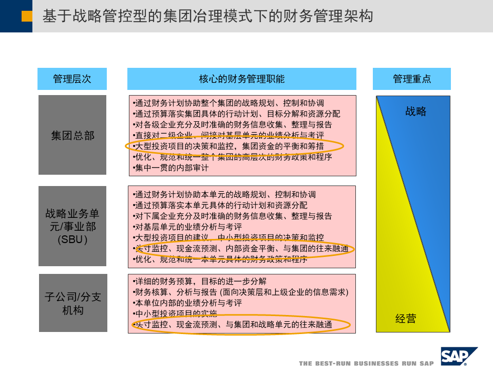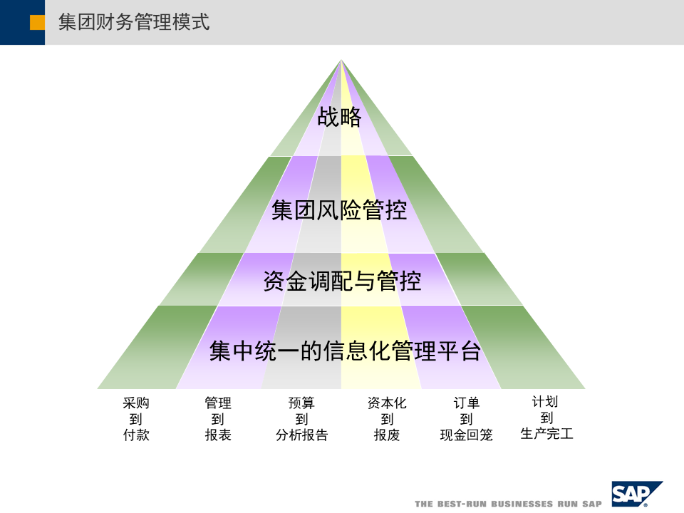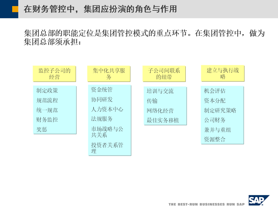 SAP集团财务管控整体方案涵盖三大管控模式、合规支持、绩效管理、预算管理及业财一体化,助力企业全球化、多元化发展,实现财务数字化转型[2][3][5]。