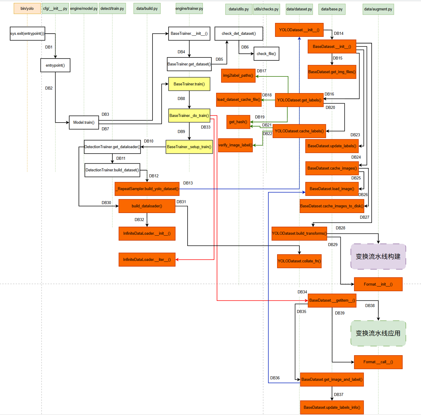 - 橙色部分:数据加载相关接口,加载训练过程中所需的数据,决定了数据的来源,把握图像和标签的加载细节(本篇的需要讲的重点内容)。