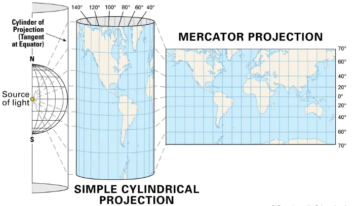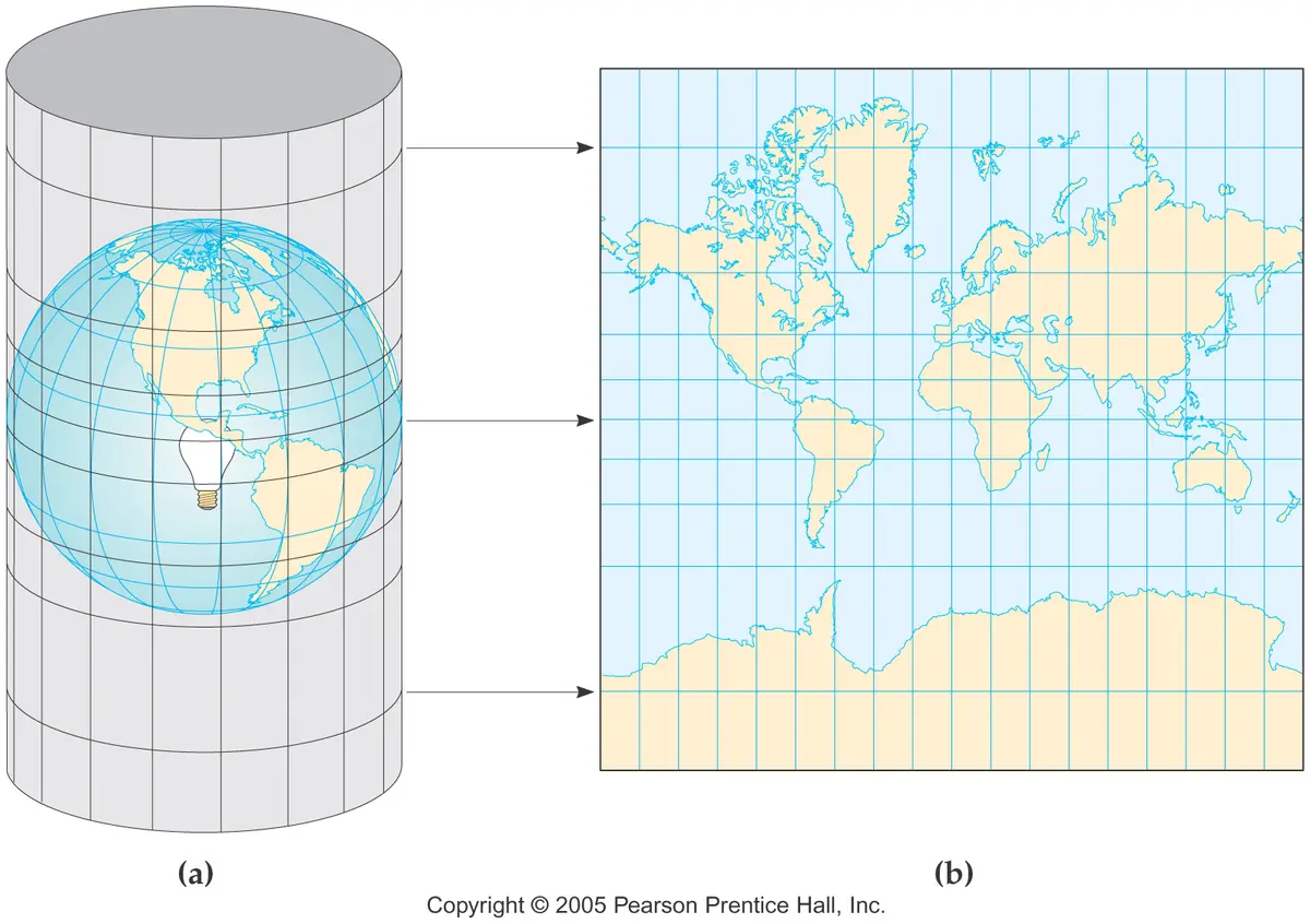 想象一个透明的地球,在其内部中心放一盏灯。我们将一张纸卷成圆柱体套在地球外面,纸面与赤道相切。当地球上的地理信息被光影投射到这张纸上并展开,就得到了墨卡托投影图。