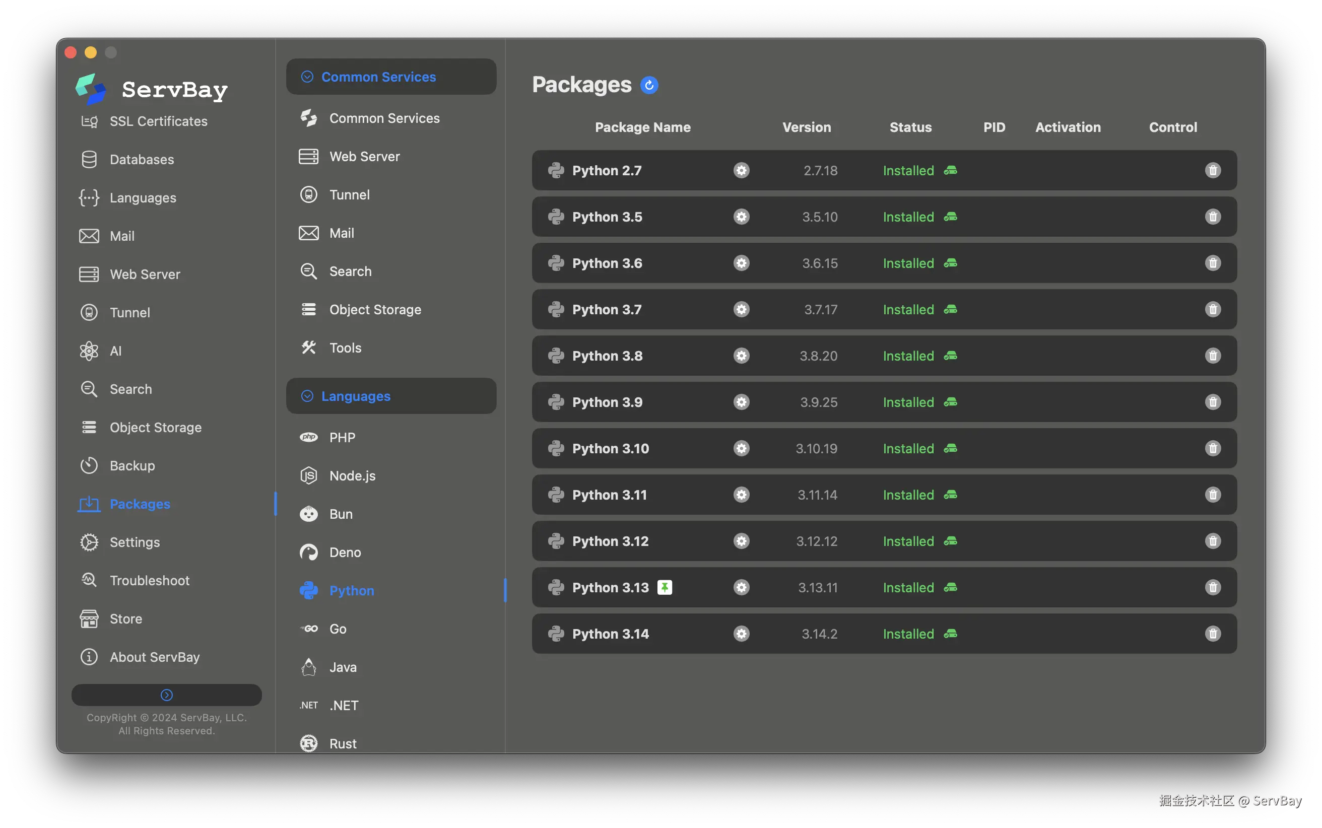 推荐使用 ServBay 来管理开发环境,它支持一键安装 Python 环境,覆盖了从半只脚踏进棺材板的 Python 2.7 到Python 3.5 乃至最新的 Python 3.14 版本。而且这些版本可以同时并存,不需要手动去配置环境变量,也不用担心弄乱系统的默认配置。装好就能用,一分钟就能搞定。