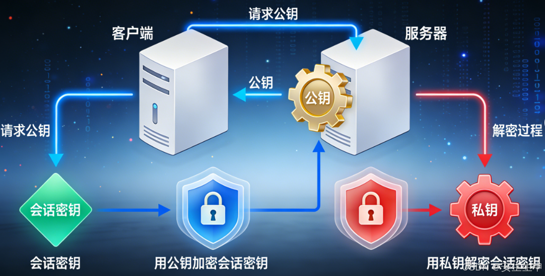 非对称加密有一对密钥:公钥(公开可获取)和私钥(仅服务器持有)。公钥加密的数据,只能用对应的私钥解密;私钥加密的数据,只能用对应的公钥解密。SSL/TLS握手阶段,服务器会将包含公钥的数字证书发送给客户端,客户端用公钥加密"会话密钥"后发送给服务器,服务器用私钥解密得到会话密钥------这一过程确保了会话密钥的安全传输,避免密钥被截获。