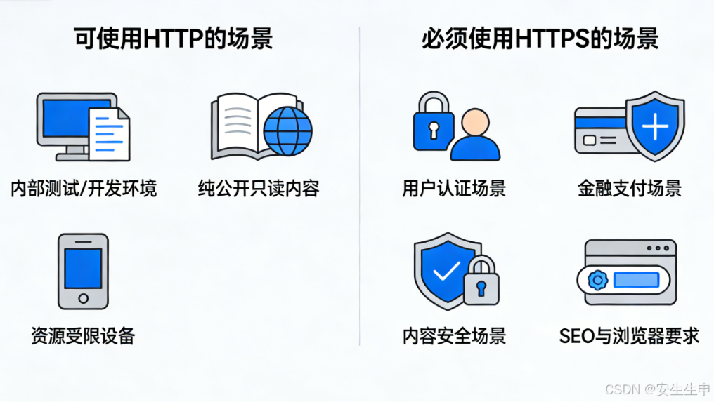 选择HTTP还是HTTPS,核心原则是:涉及敏感信息,必用HTTPS;纯公开信息且无安全需求,可酌情用HTTP。