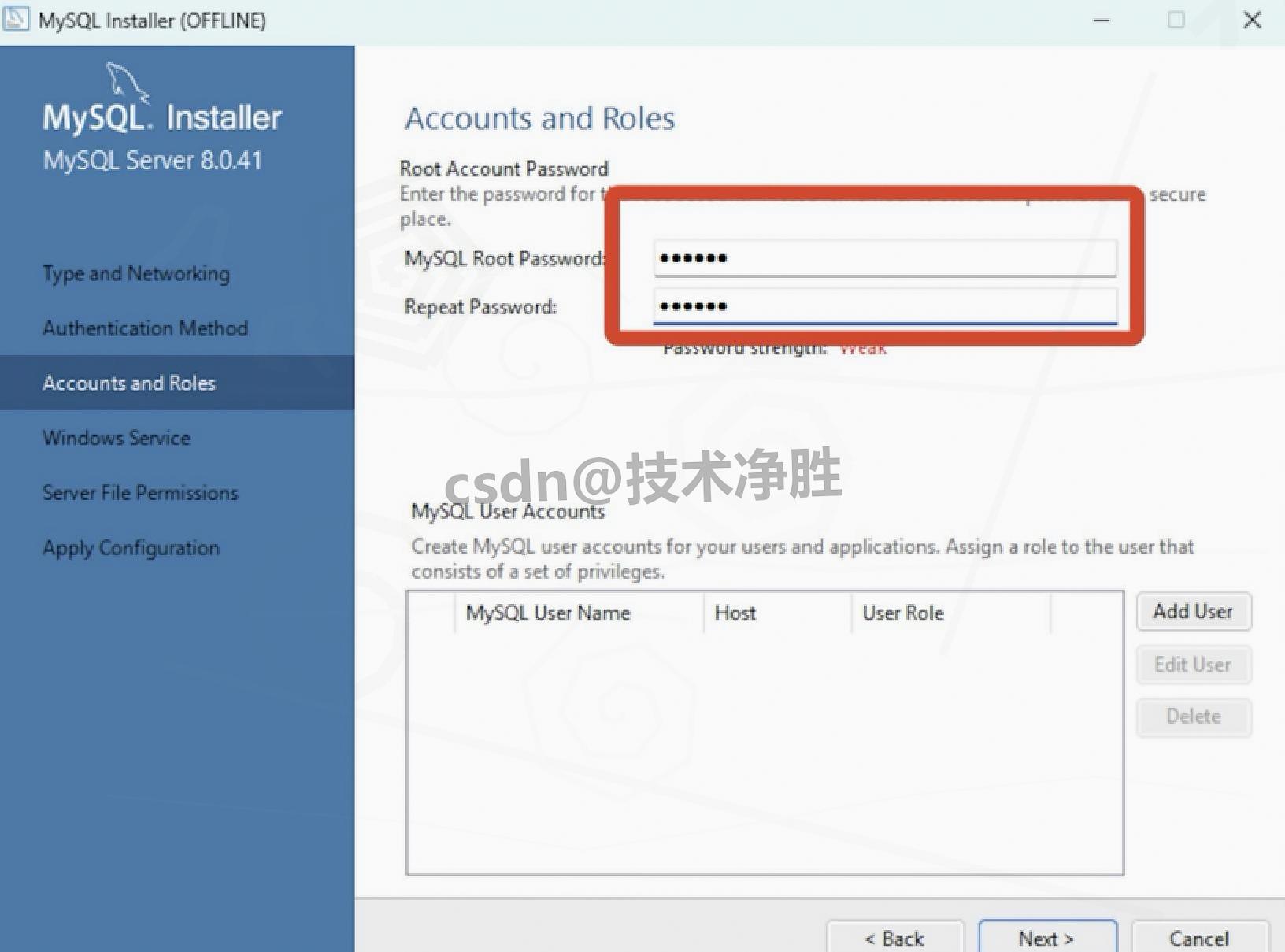 进入 "Accounts and Roles" 页面,在 "Root Password" 栏输入自定义密码(建议含字母、数字、特殊符号,例如:Mysql8.0@2024),"Confirm Password" 栏重复输入,点击 "Next"。