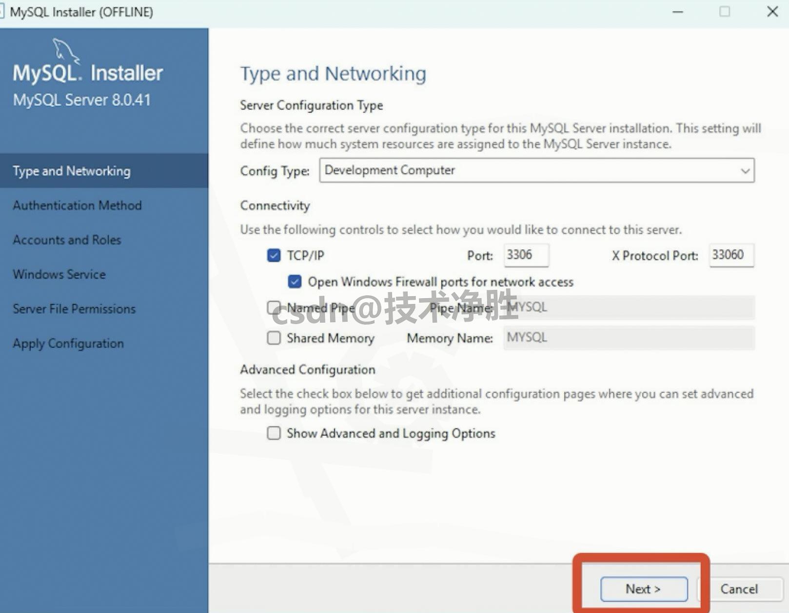 - 进入 "Type and Networking" 页面,默认选中 "Development Computer"(开发计算机模式),端口保持默认 "3306"(若端口被占用,可修改为 3307 等未占用端口),点击 "Next"。