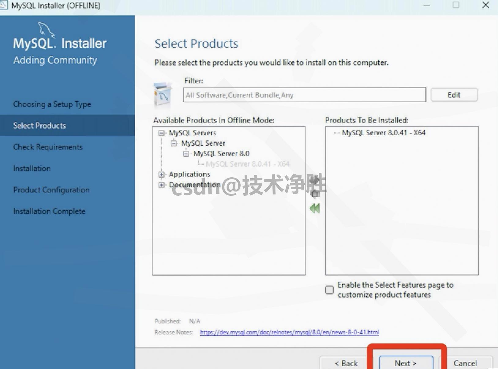 在 "Select Products and Features" 页面,左侧展开 "MySQL Servers"→"MySQL Server 8.0"→"MySQL Server 8.0.41- X64",选中后点击右侧 "→" 箭头,将组件添加到右侧 "Products/Features To Be Installed" 列表。