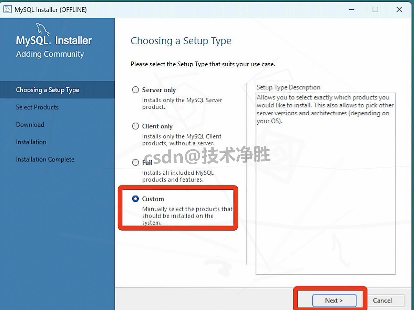 进入 "Choosing a Setup Type"(安装类型选择),选中 Custom(自定义安装) (推荐新手选择,可灵活配置组件),点击 "Next"。