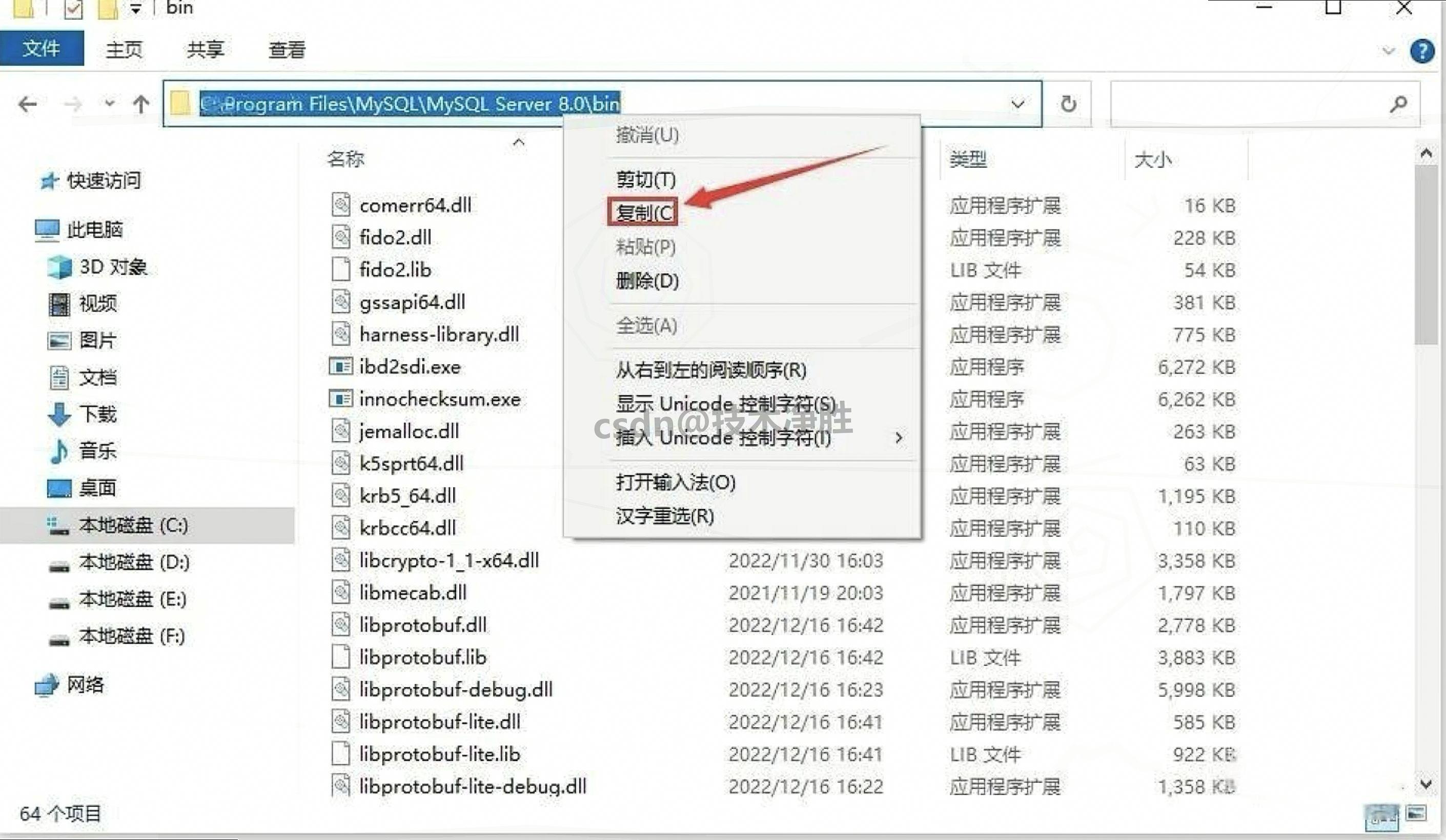 - 打开 MySQL 安装目录(例如:C:\Program Files\MySQL\MySQL Server 8.0\),进入 "bin" 文件夹,复制当前路径(例如:C:\Program Files\MySQL\MySQL Server 8.0\bin)。