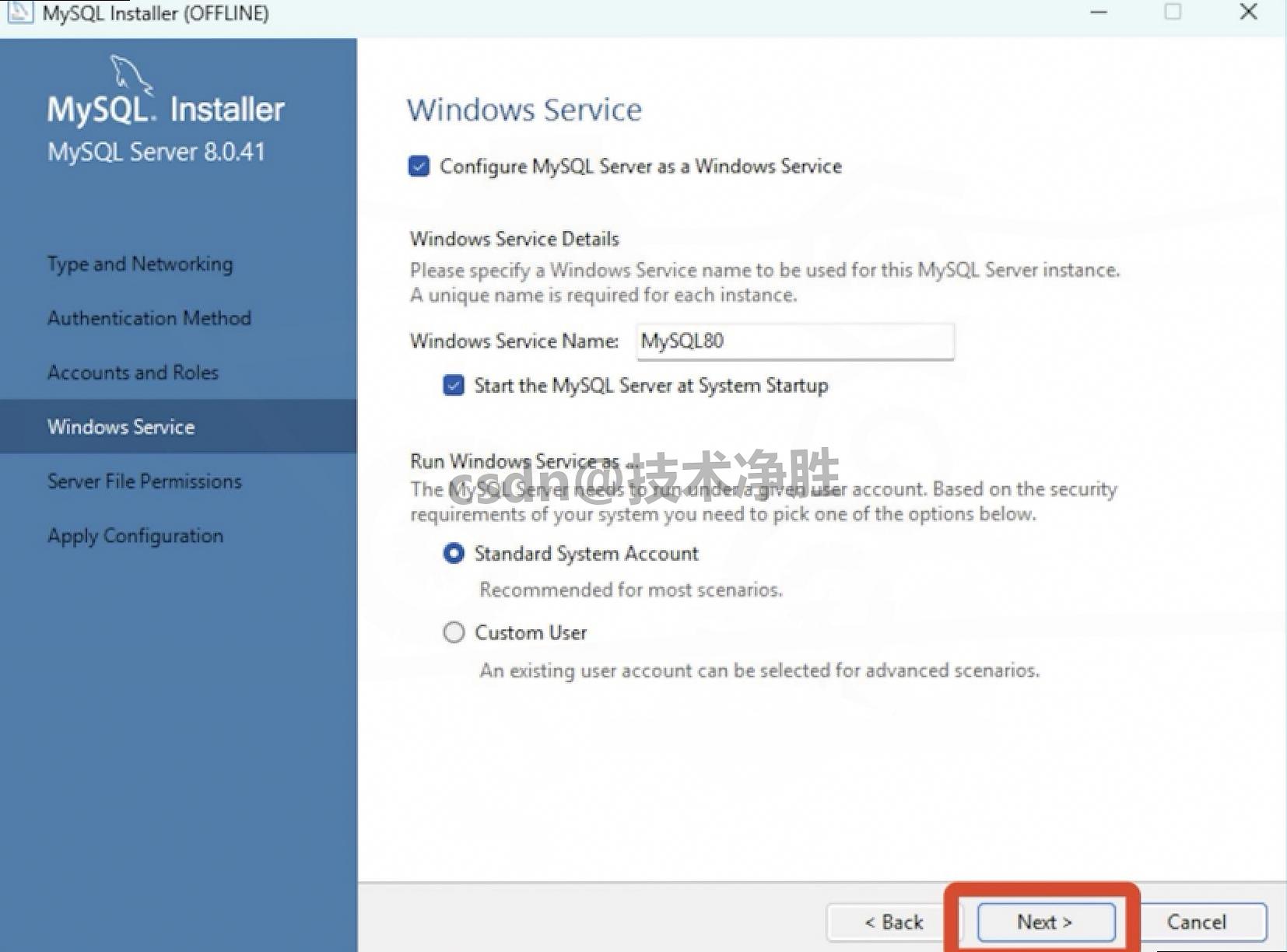 - 进入 "Windows Service" 页面,默认服务名称为 "MySQL80",勾选 "Start the MySQL Server at System Startup"(开机自动启动,可选),点击 "Next"。