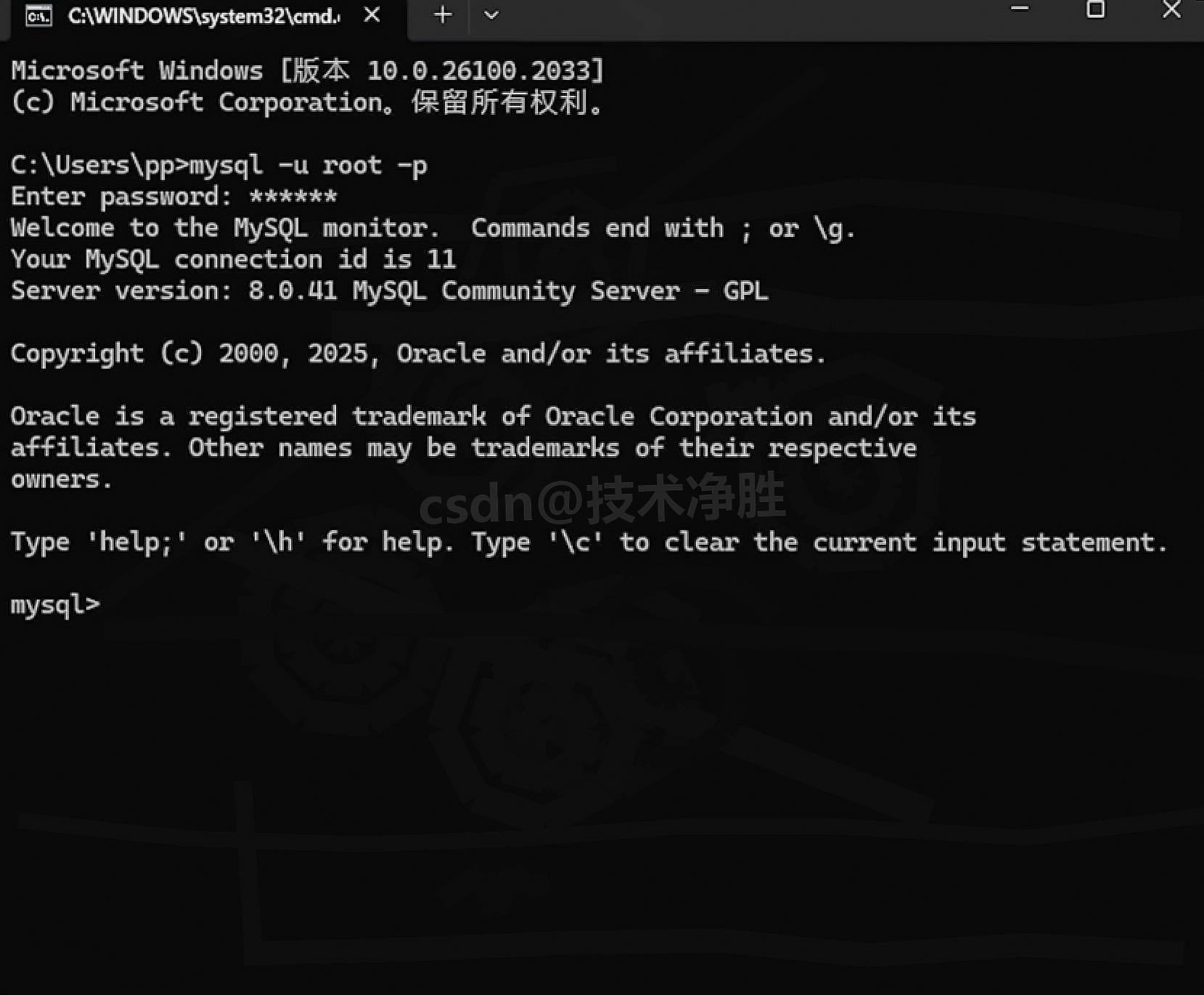 - 若出现 "Welcome to the MySQL monitor." 提示语,且命令行变为 "mysql>",说明 MySQL 8.0.41安装成功并已正常启动。