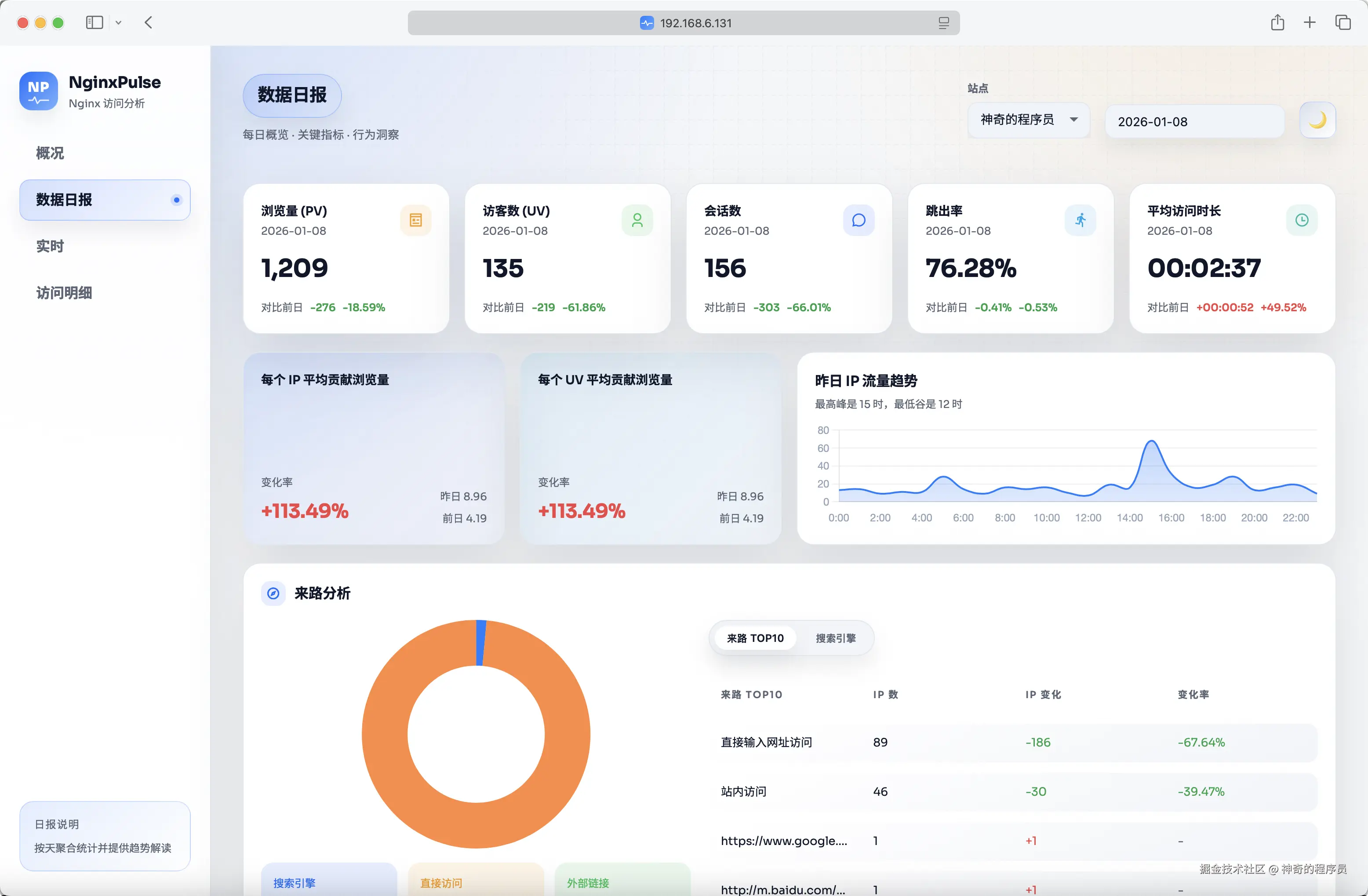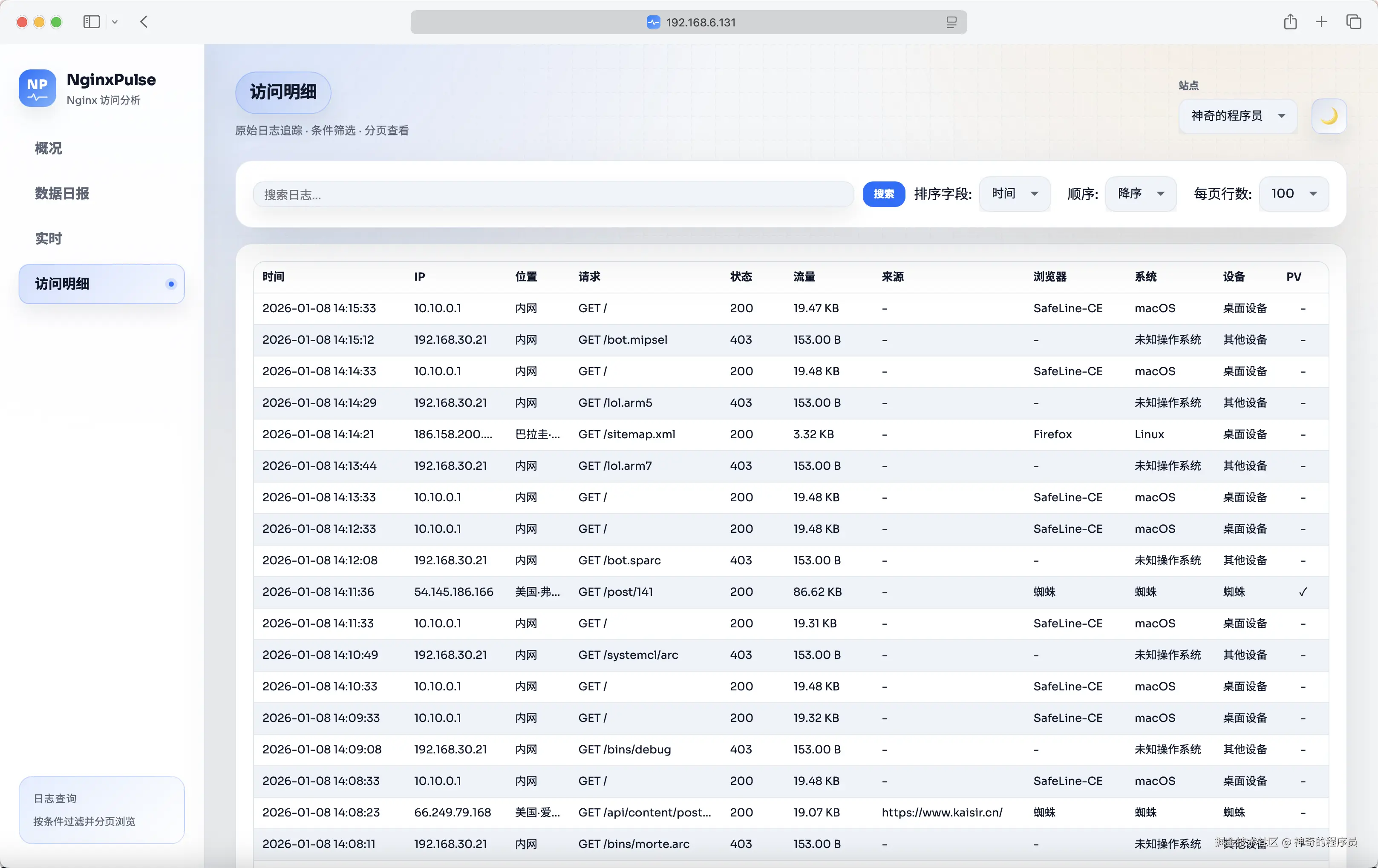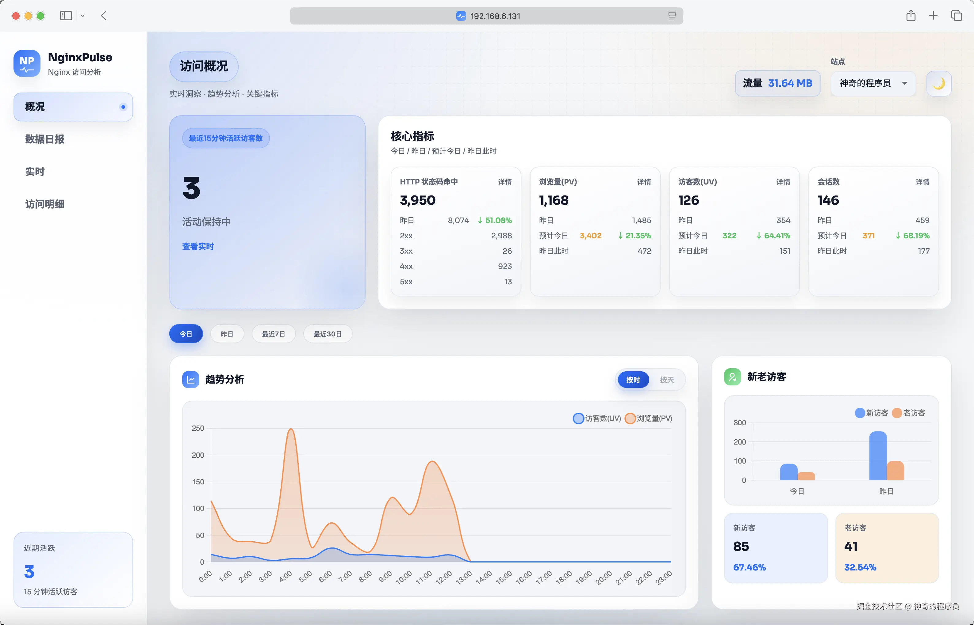 为了方便使用,我已经将这个项目打包成镜像发布到dockerhub上了,镜像名为magiccoders/nginxpulse,可以通过docker的形式使用,也可以通过docker compose的形式使用。