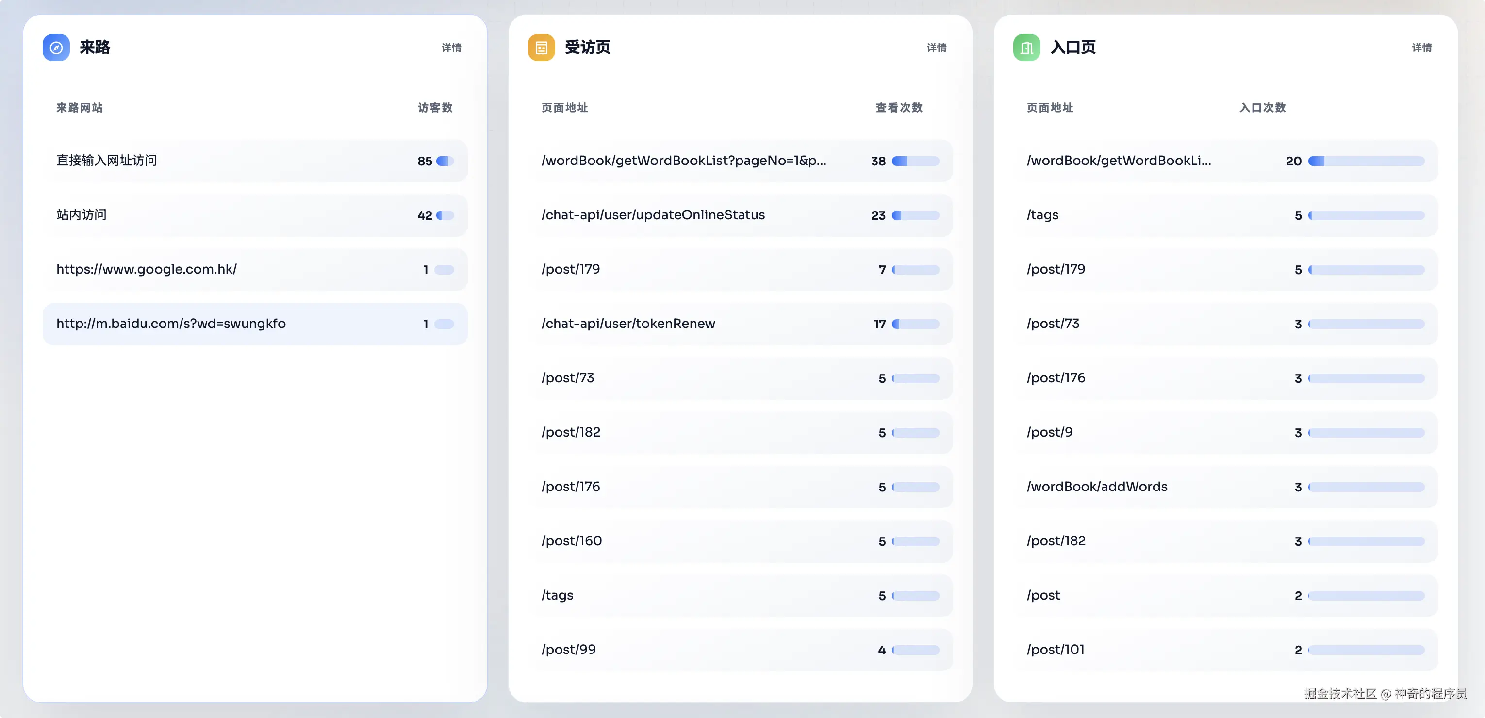 这部分可以看到访客的来源,以及每个路径的访问次数。