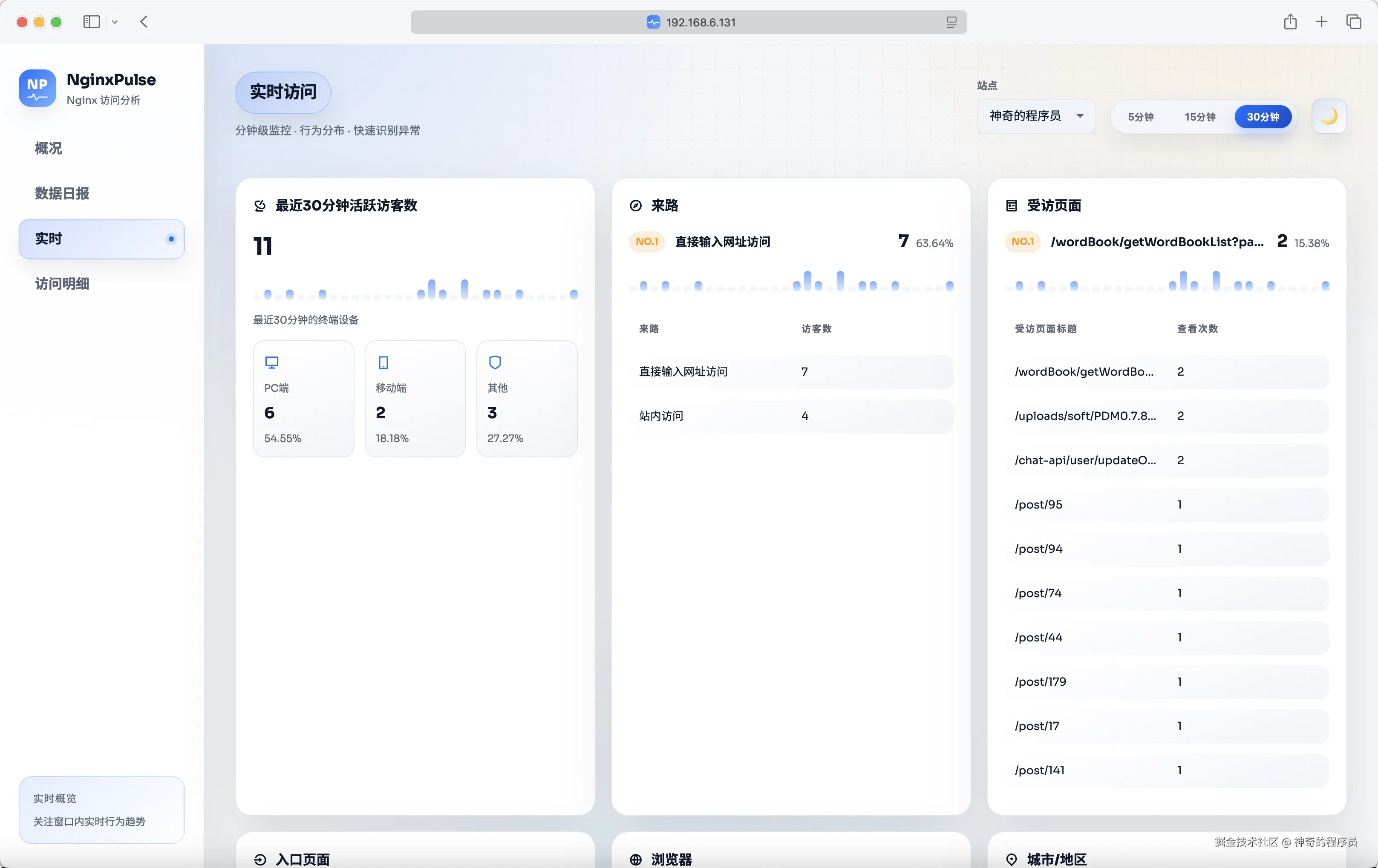 在这个模块里,可以查看最近5/15/30分钟内的访问情况