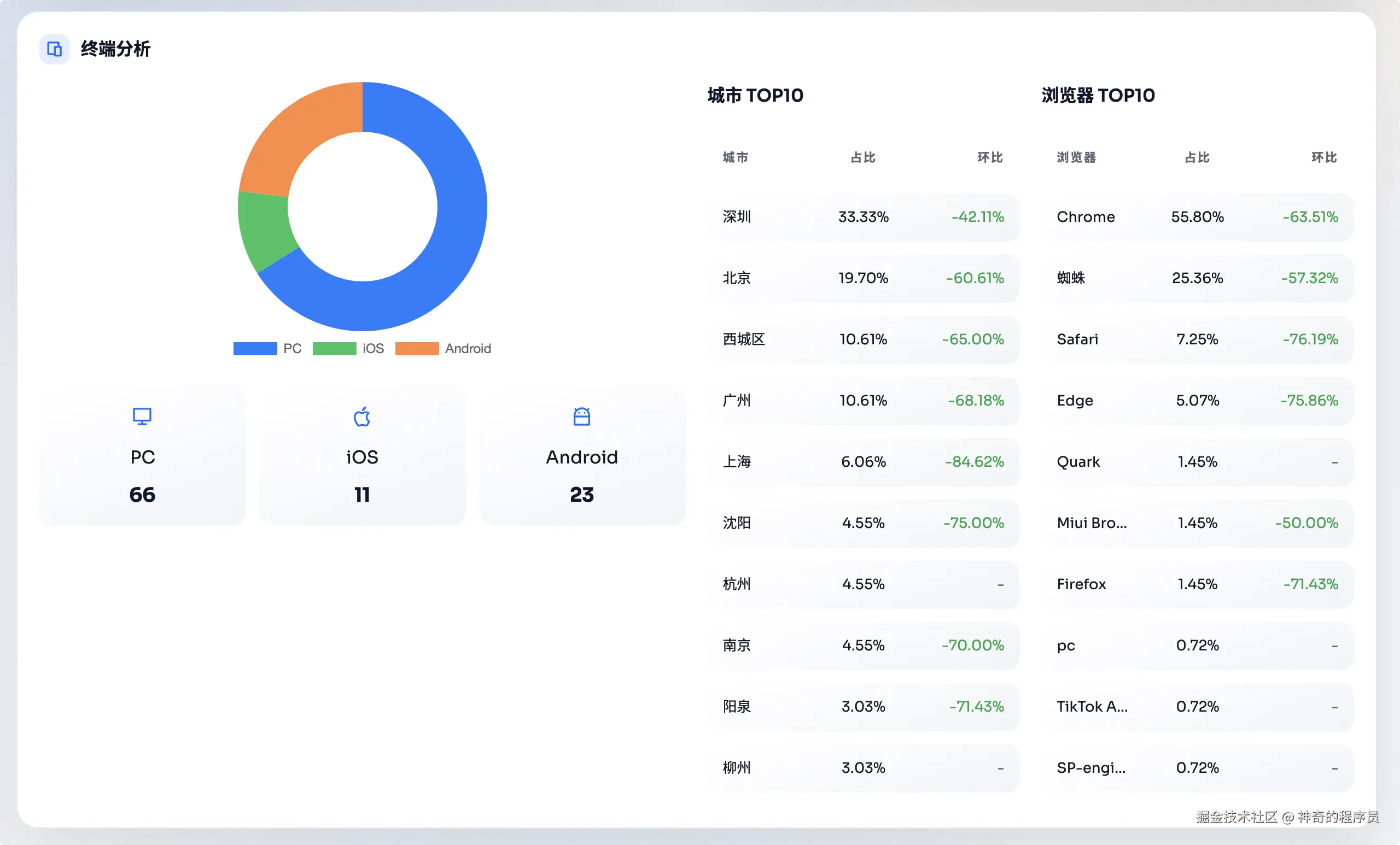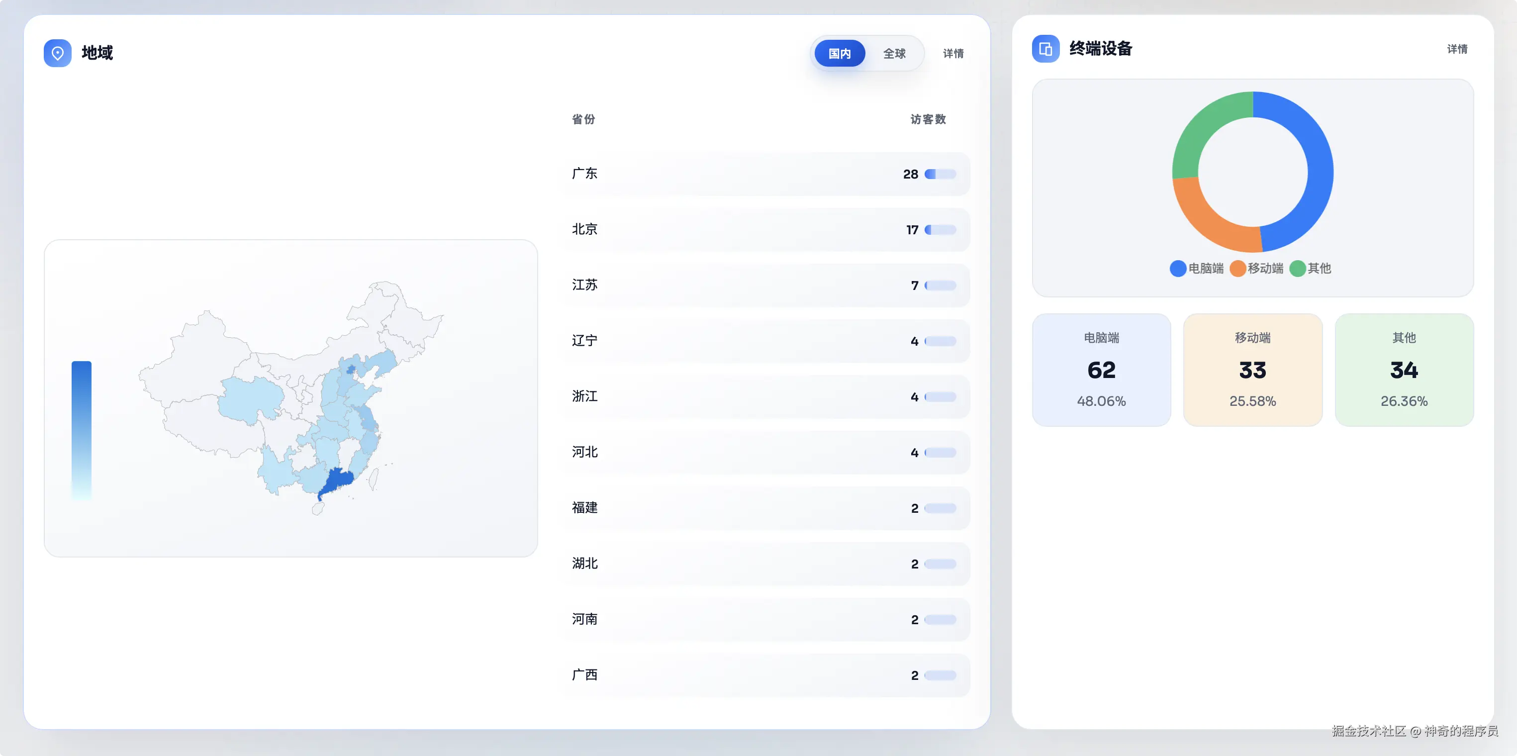这部分可以看到每个省份的访问情况以及访问设备的分布情况。