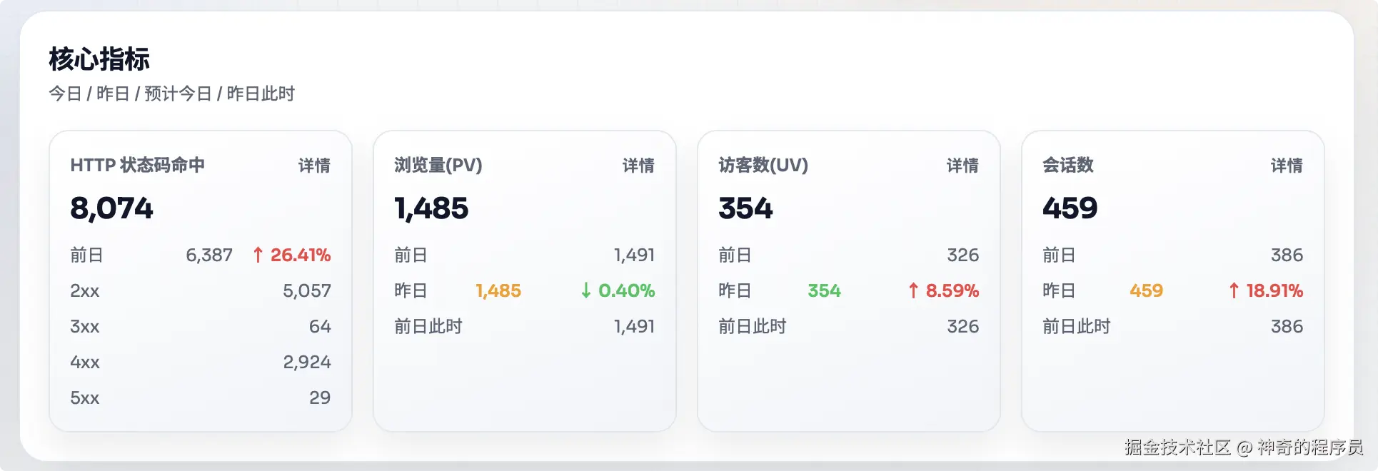 在这个维度中,针对http状态码、浏览量、访客数、会话数做了更细致的划分。