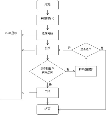 系统设计的软件流程图如图4.2所示。系统一共设计了三种商品,分别为coke、juice、sprite,对应三个不同的价格,分别为3元、4元、5元。当顾客根据显示屏现实的内容,按下对应的按键,选择想要的商品种类及其数量,系统会根据顾客选择的商品数量计算出应付的金额。接着顾客开始投币付款,投币器会计算投币的数量,单片机接受信号,显示在OLED显示屏,如果顾客投币的数量小于选择商品的总价,顾客依然点击了出货键,则报警电路工作,蜂鸣器想起,报警指示灯里亮红,显示屏显示"Tou Bi Bu Zu!!!",显示完后返回主界面,顾客可选择按下退币按键,系统退币,顾客也可以选择继续投币,如果顾客投币的数量和选择的商品总价相等,顾客按下出货键,商品开始出货,对应货物的LED灯亮起,显示屏显示"Kai Shi Chu Huo...",一段时间后,显示"Chu Huo Wan Cheng!!!",随即出货指示灯灭。