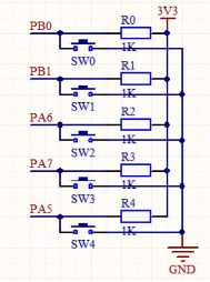 本系统采用5个SW0-SW4微型开关组成的按键输入模块。液晶显示屏的显示内容可以由键盘输入来进行控制。同时可以切换商品选择及其数量加减,对应的微动开关SW0-SW4接口电路如下图3.19所示。