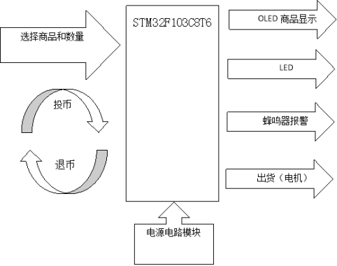 本次设计的自动售货机以STM32F103C8T6芯片为核心,其自动控制系统以模块化方式进行设计,主要由电源电路模块、商品选择模块、投币模块、OLED显示模块、出货模块、报警模块及LED灯模块组成。其中,商品选择模块采用按键输入,方便顾客选择自己想要的商品种类及其数量;投币模块采用TW-2020型硬币器,进行顾客投币及找零;OLED显示模块采用1.3寸OLED显示屏,显示商品的种类、数量,投币数量及电机处于出货状态还是投币不足状态;出货模块采用CY-VGMS-277弹簧电机,将顾客购买的商品移出;报警模块包含声音报警和灯光报警,并以蜂鸣器的声音方式发出,同时LED灯提醒消费者投币不足;LED灯模块就采用LED灯,提示顾客从哪一个通道出货。整个系统的总体设计框图,如图2.1所示。