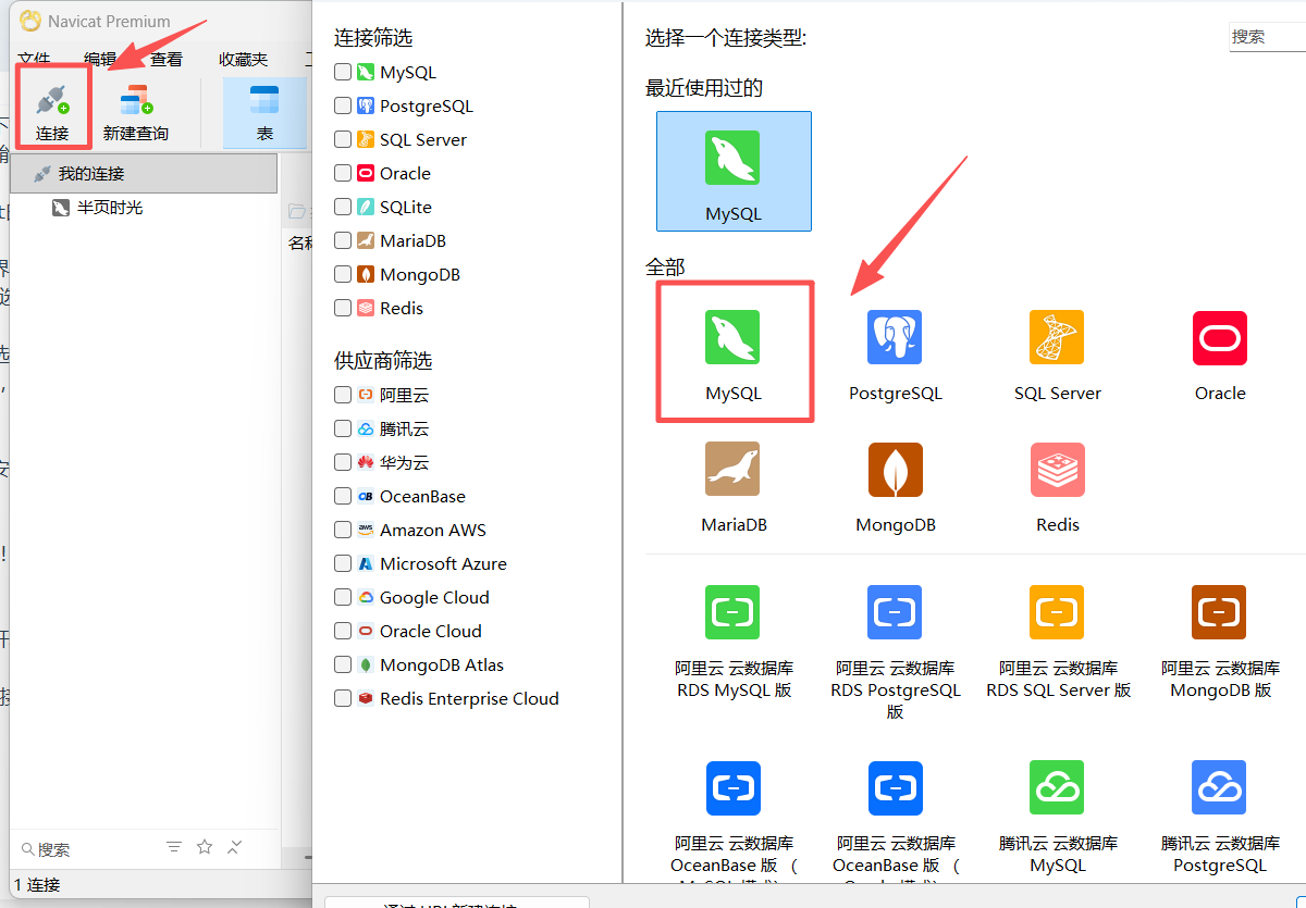 点击左上角连接,在弹窗中选择你要连接的数据库类型(以MySQL为例)