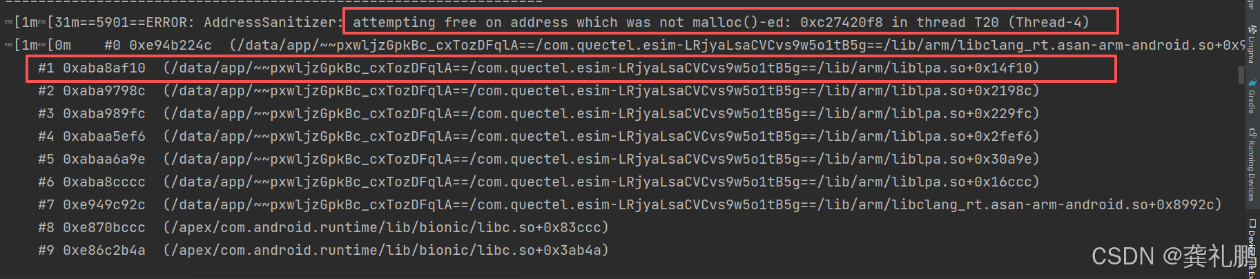Address 0xc99ce0f8 is located in stack of thread T20 (Thread-4)。这是最关键的线索 ,它表明您的程序试图释放(free)的内存地址是一个位于**线程栈(stack)**上的局部变量,而栈内存是由系统自动管理(函数返回时自动回收)的,绝不能手动释放。 -