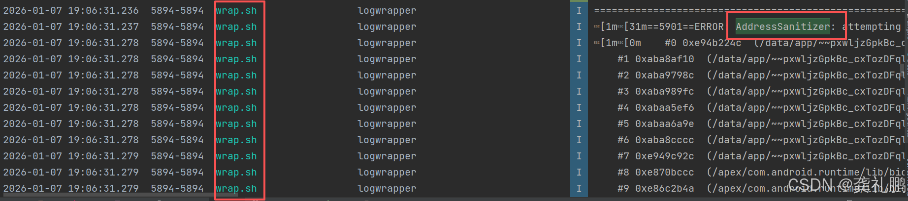 上述集成完成,然后我们运行应用,如果有wrap.sh相关的AddressSanitizer打印说明我们集成成功了,如下: