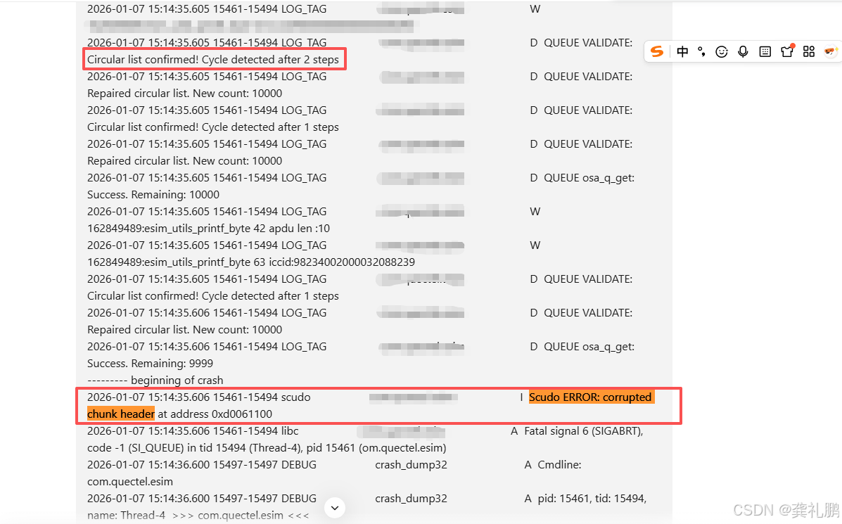 直接触发点 :在 osa_free中释放某个内存块(地址 0xd0061100)时,Scudo 验证发现其头部校验和不匹配 。头部可能因内存越界写入 (如缓冲区溢出)或使用已释放内存(use-after-free)而损坏 。