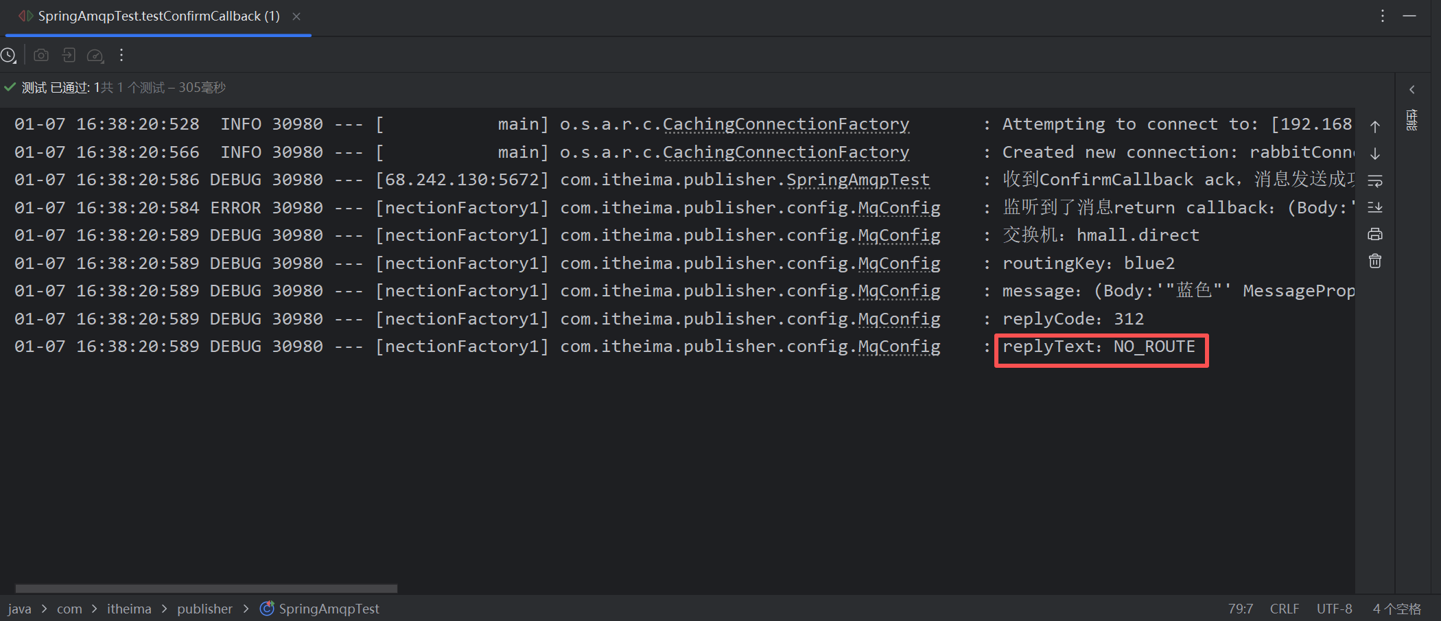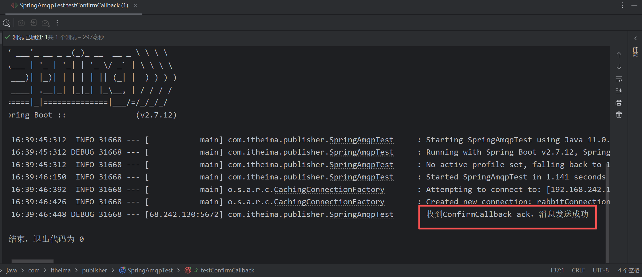 然后我们可以通过配置一个配置类来对确认机制初始化,这个类将在生产者发送消息后自动初始化,输出对应参数的日志: