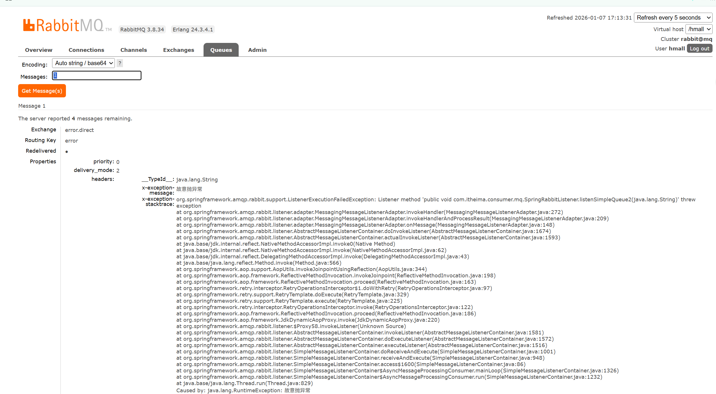 首先要明确消费者失败是指什么,其实这里就是指消费者处理消息的时候失败,也就是消费者抛异常了,当配置了确认机制时,这个消息将不会直接消失,而是会重新入队(requeue),然后重新发给消费者,直到不抛异常。