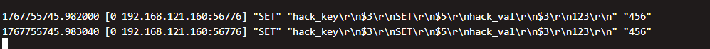 RESP协议的封装,redis_cmd会将所有参数按协议规范封装(长度\\r\\n值\\r\\n),对于参数中的\\r\\n协议分隔符会自动转义为普通字符,构造含 \\r\\n3\r\nsET\r\n$5\r\nhack_val\r\n 的二进制恶意内容,最终仅作为 SET 命令的 key字符串存储,Redis 未解析出注入的 sET hack_val 123 命令。