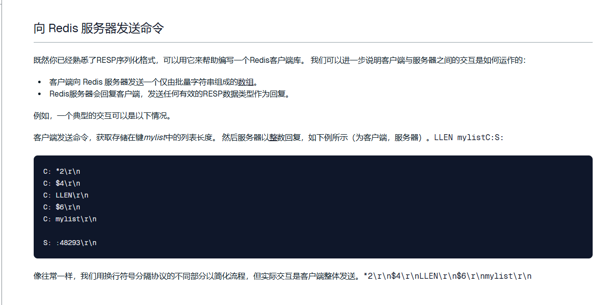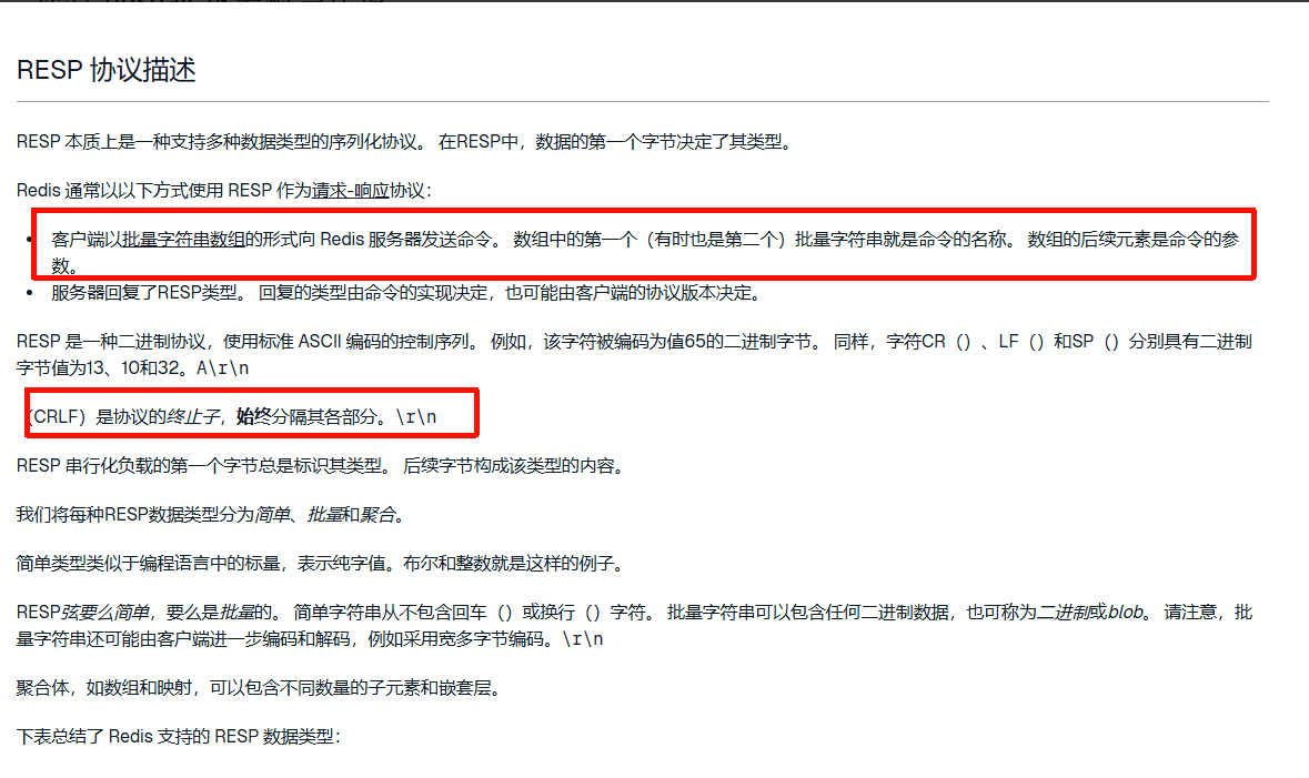 接着redis官方提供了对于RESP的详细介绍,包括服务器端收到消息会怎么解析,以及客户端以怎样的形式去发送redis的命令,下面是链接,可以查看