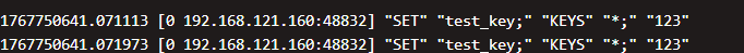 核心逻辑:直接拼接恶意命令; KEYS *;到 SET 字符串中,模拟注入漏洞,验证 Redis 会执行注入命令。