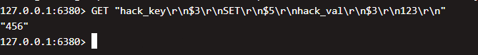 可以发现设置了"hack_key\r\n3\\r\\nSET\\r\\n5\r\nhack_val\r\n$3\r\n123\r\n"整体的值为456
