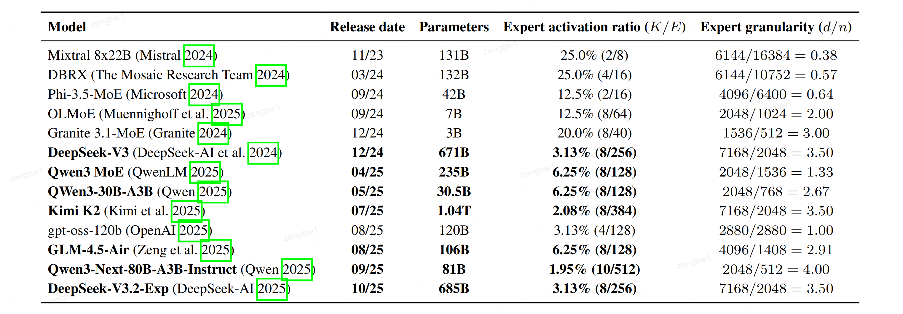 表1:MoE Scaling趋势分析:本表展示专家激活率(即每个标记K对应的专家激活数K/E)与专家粒度(模型嵌入维度d与专家中间层规模n的比值),数据来源于前沿开源模型。计算模型增强稀疏度时未包含共享专家。趋势表明,新型开源模型增强模型往往具有更精细的粒度和更稀疏的结构。