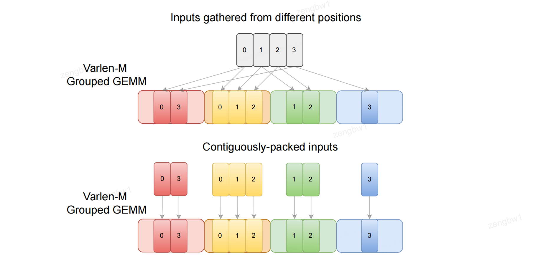 图2:MoE计算通常需要使用分组 GEMM 。每位专家从输入张量的不同位置收集输入(上图),或从分组输入数组中读取连续数据块(下图)。该图改编自 Tan 等人(2024年)的图2。