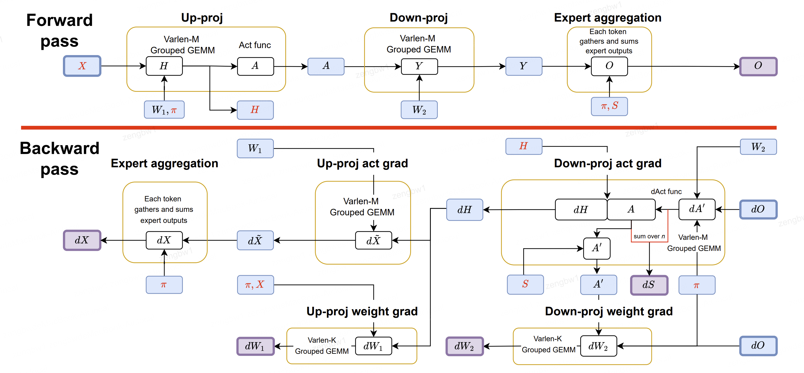 图4:SonicMoE的8个已启动内核计算流程,按黄色方框分组。其中3号和5号内核分别负责前向和后向计算。黄色圆圈的流入箭头表示变量从 HBM 加载到 SRAM ,流出箭头则代表变量存储到 HBM 。 HBM 中所有变量的方框均采用颜色区分:紫色方框表示前向和后向计算的输出结果,蓝色方框表示中间变量或权重(W1、W2)。所有缓存激活值X、H、 π 、S均以红色标注。算法2正式描述了SonicMoE的前向传播过程,算法3和5则描述了后向传播过程。