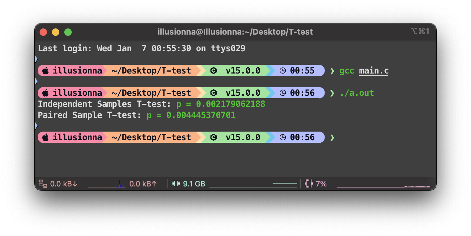 源代码链接:https://github.com/Illusionna/tiny-stats/blob/main/t-test.c