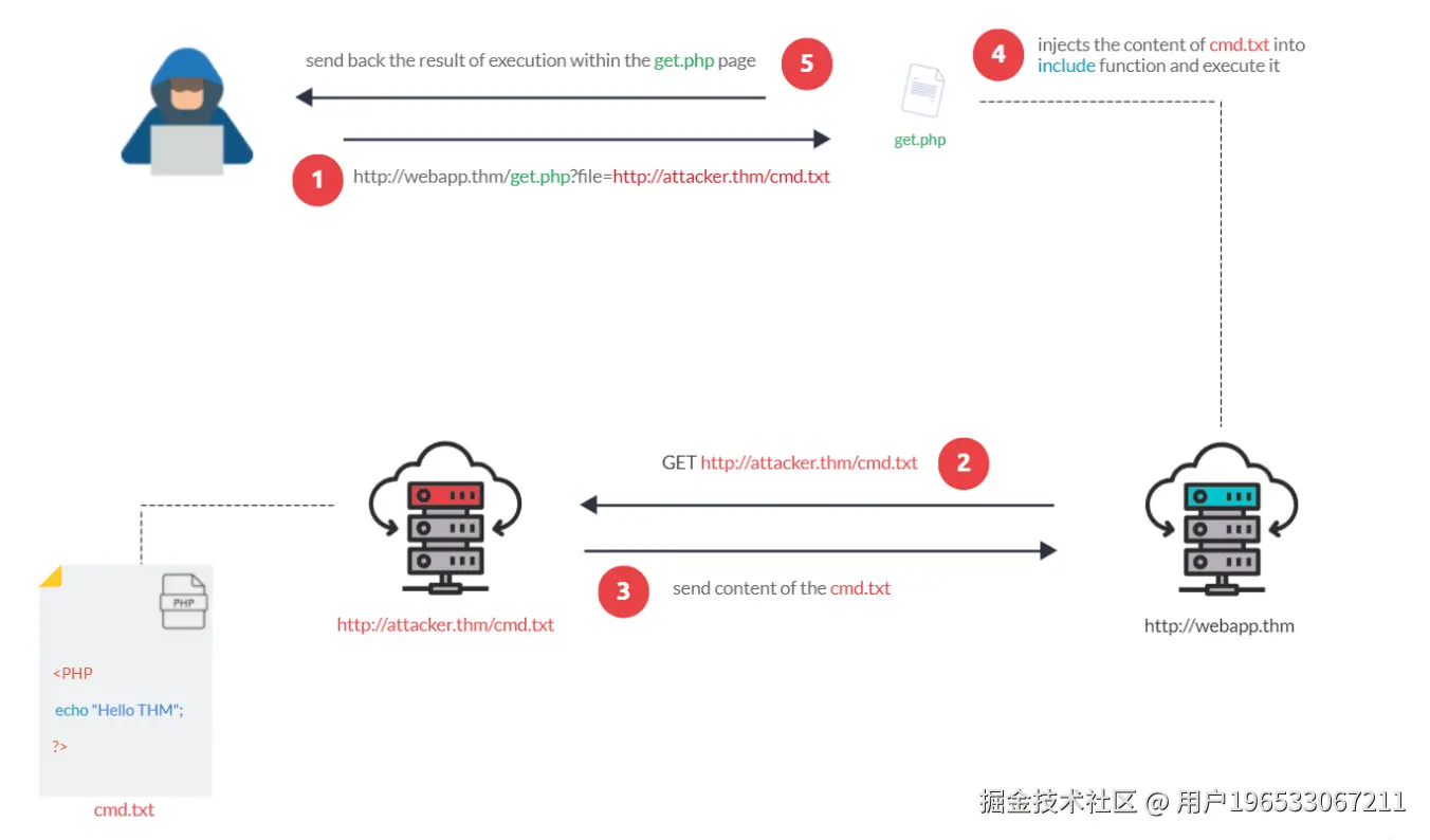 攻击者在自己的服务器上托管一个 PHP 文件 http://attacker.thm/cmd.txt,其中 cmd.txt 包含打印消息 Hello THM。