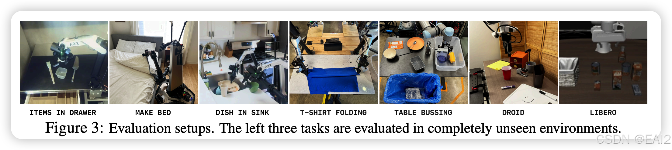 真机实验:包括 "Items in drawer"(物体放入抽屉)、"Table bussing"(餐桌清理)、"Shirt folding"(叠衬衫)等长程任务。使用了不同形态的机器人(单臂 Franka/UR5、双臂移动操作机器人)。