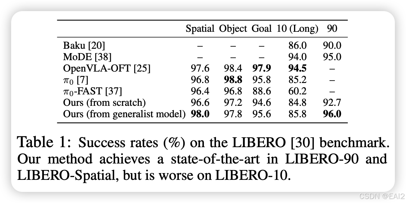 - 在 LIBERO-90 和 LIBERO-Spatial 上达到了新的 SOTA(Table 1)。