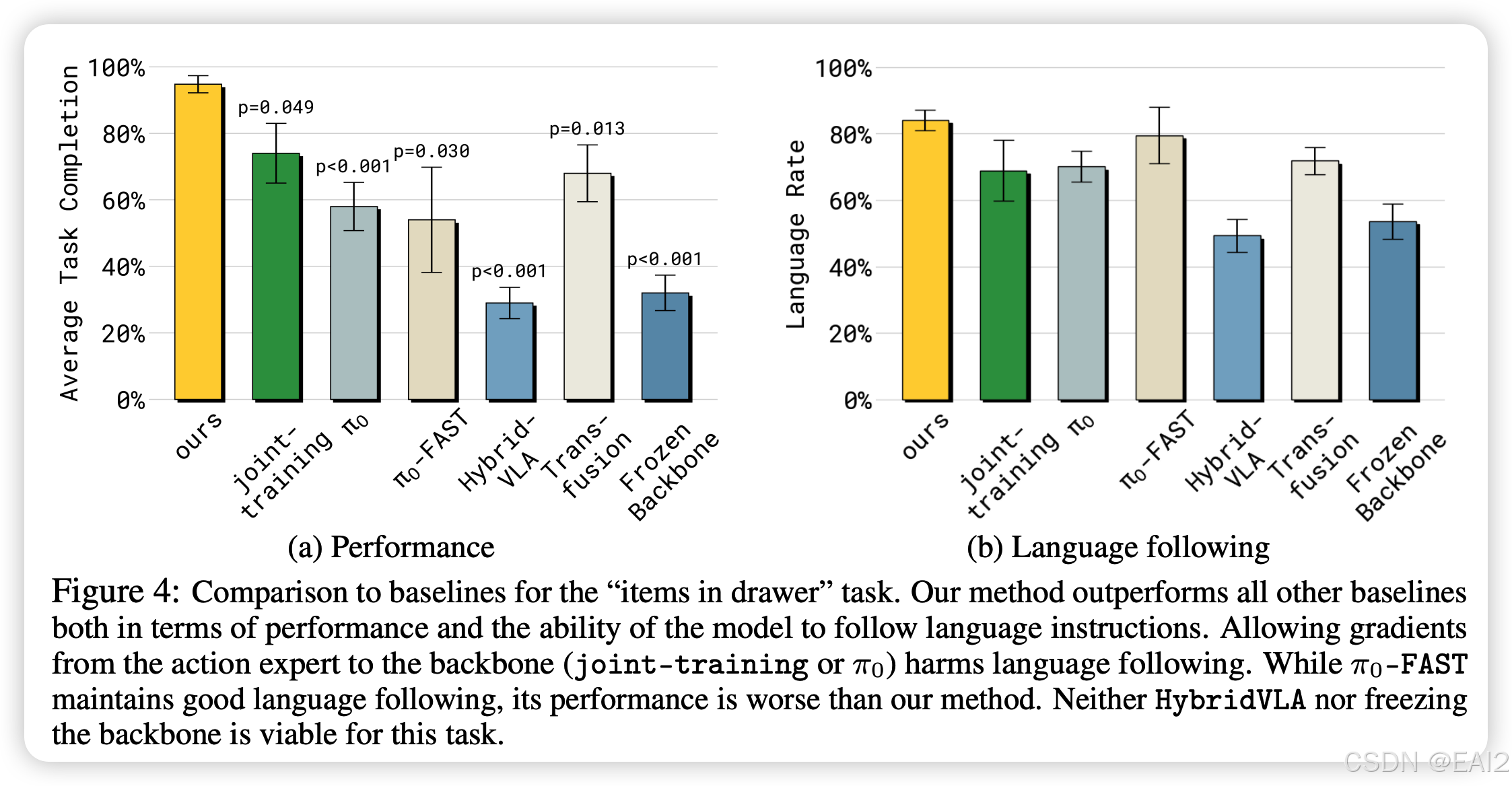 - Figure 4b 显示,阻断梯度(Insulation)对于保持高水平的 Language Following Rate 至关重要(80%+ vs HybridVLA/ 的 ~50%)。