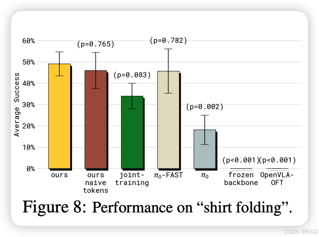 - 推理速度 :由于 Action Expert 较小且采用 Flow Matching,推理延迟远低于自回归模型(Figure 2)。