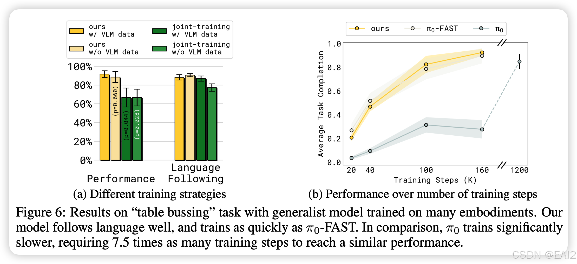 - 训练速度 :Figure 6b 展示了收敛速度与离散模型(FAST)一样快,远快于纯 Flow Matching 的 ( 需要 7.5 倍的步数才能达到相似性能)。