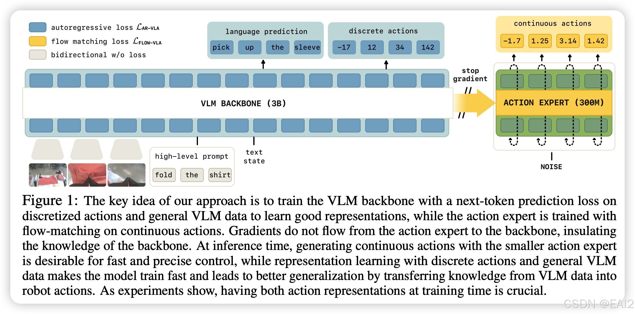 - 关键机制:知识隔离 (Knowledge Insulation) :如 Figure 1 所示,模型在 Action Expert 和 VLM Backbone 之间实施了 Stop Gradient 操作 。