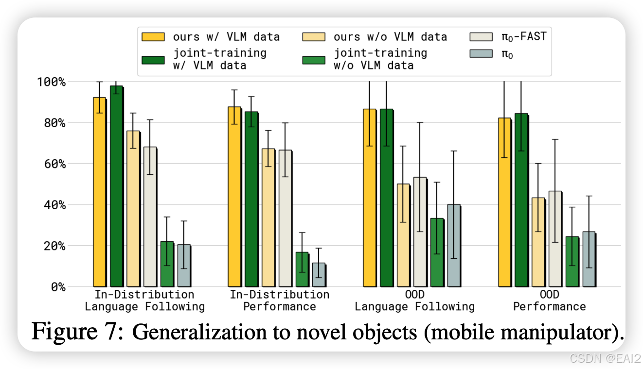 - 在移动机器人未见物体(OOD)测试中,Co-training VLM 数据显著提升了成功率(Figure 7)。