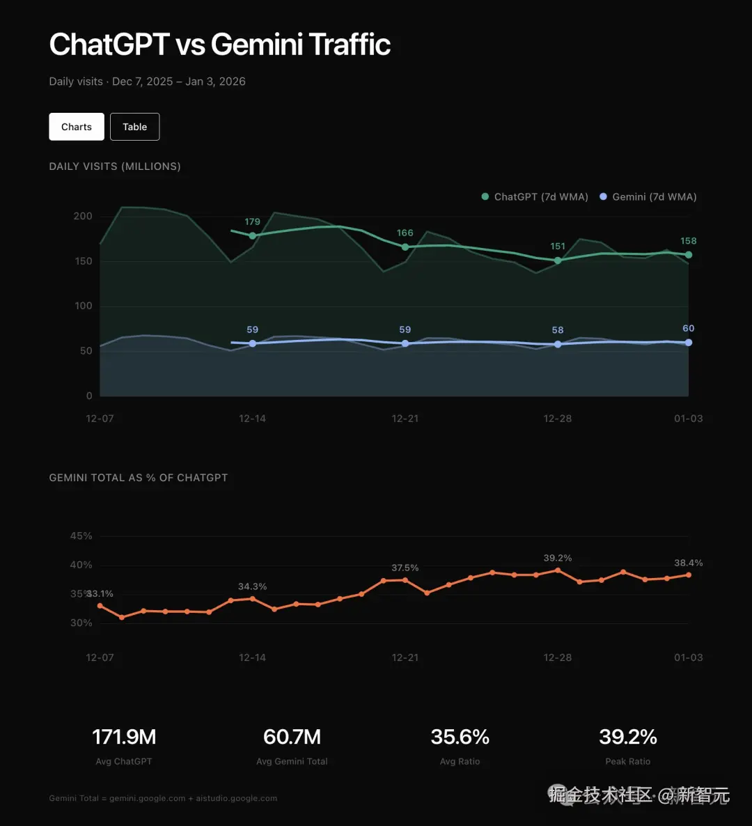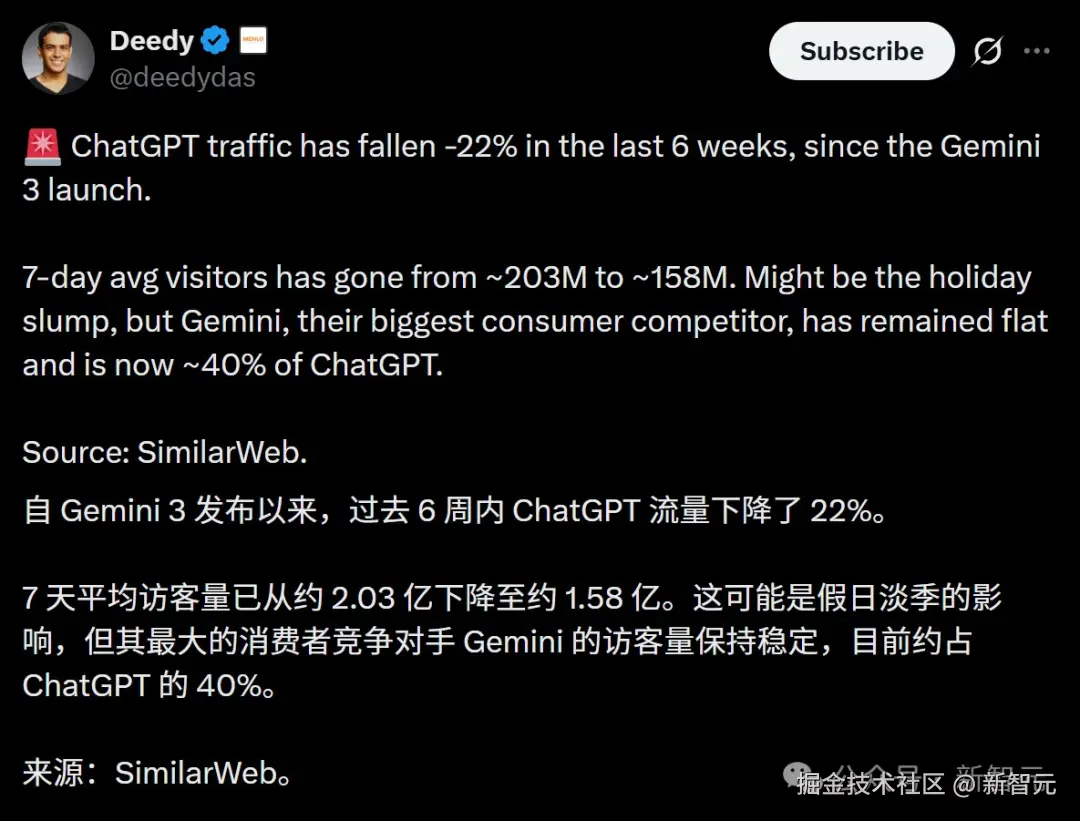 自**「去年 11 月谷歌发布 Gemini 3 Pro」** 以来:「ChatGPT 网站 「「流量」 」骤降,Gemini 的网站流量则快速上升。」