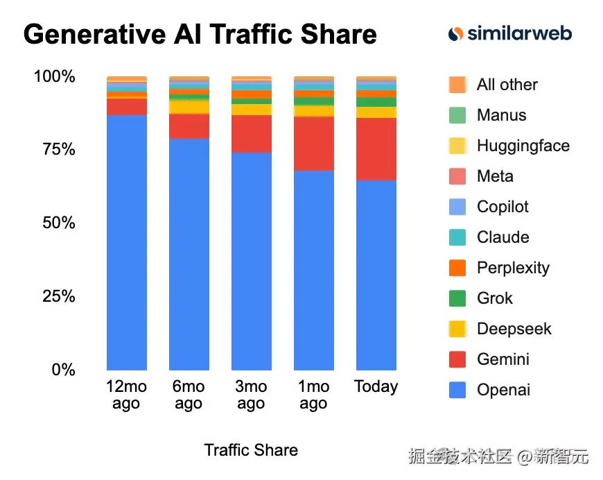 如开头所言,Similarweb 的这张流量对比图,揭示了一个让 OpenAI 极其危险的信号------AI 竞赛的风向,变了!