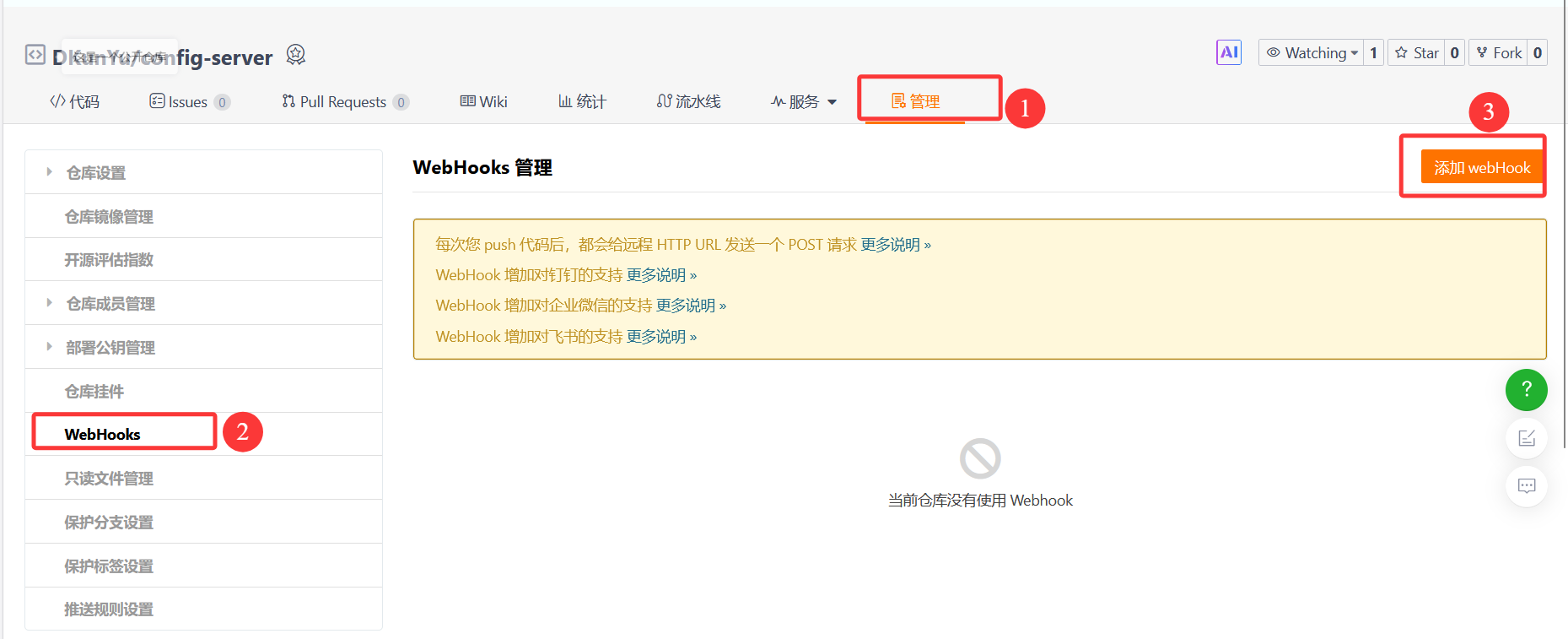 每次修改都需要⼿动访问refresh接⼝, 这样也很不⽅便.Gitee 提供了⼀种 webhook 的⽅式, 当有代码变更的时候, 会调⽤我们设置的地址,来实现我们想达到的⽬的.