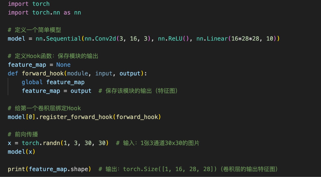 Hook 函数在PyTorch 中用于修改张量或模块中间结果,核心是在不修改模型结构的前提下,获取模型前向 / 反向传播中的中间数据(如特征图、梯度)。